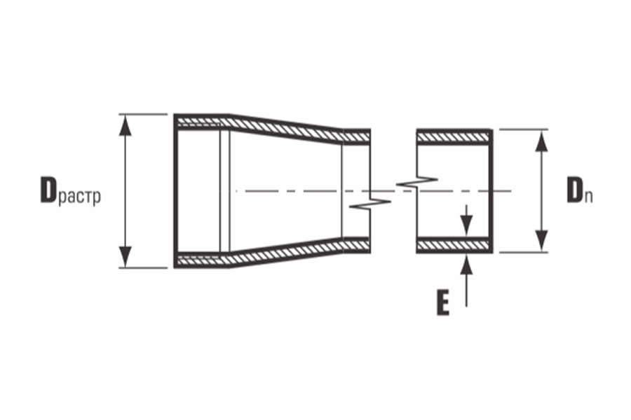 Один конец с раструбом с внутренней резьбой, другой - гладкий с наружной резьбой.