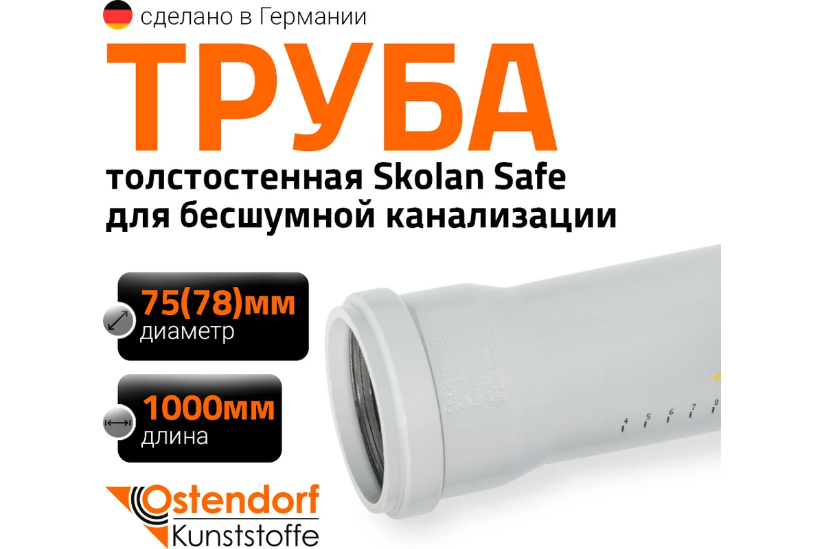 Труба бесшумной канализации Ostendorf Skolan Safe предназначена для отведения сточных вод внутри зданий и обеспечения комфорта по шумоизоляции. Она оснащена раструбным соединением и немецким уплотнительным кольцом, что обеспечивает простоту и надежность монтажа.