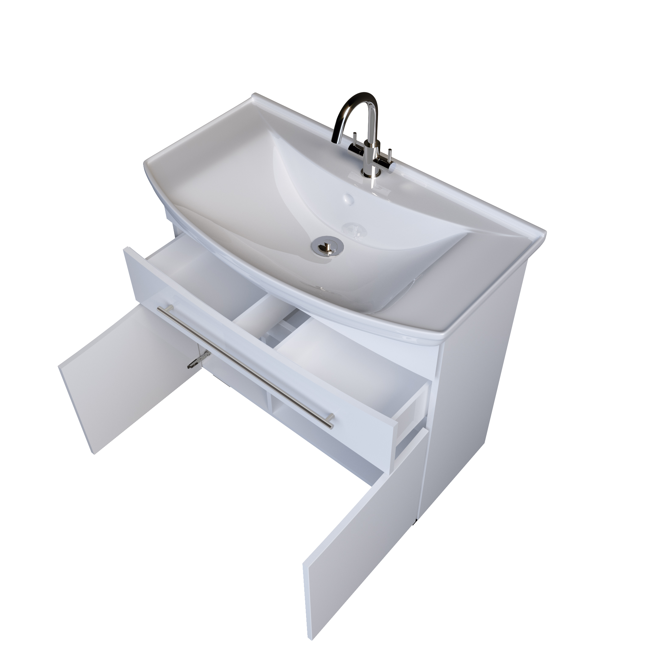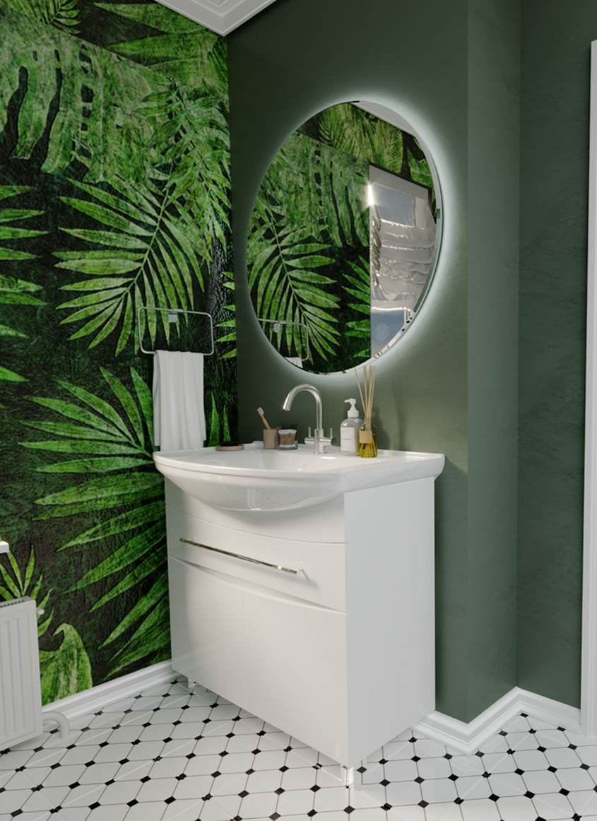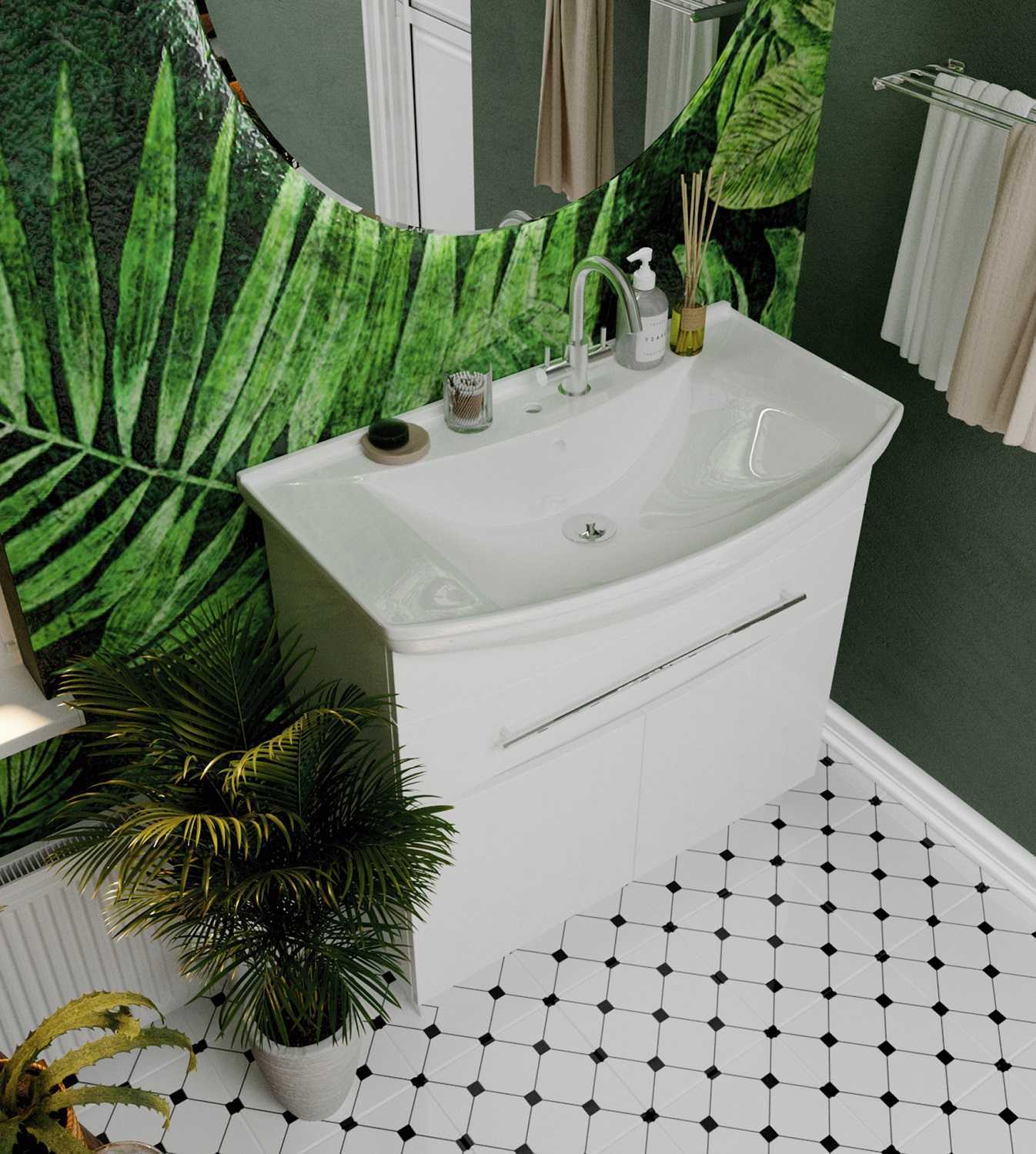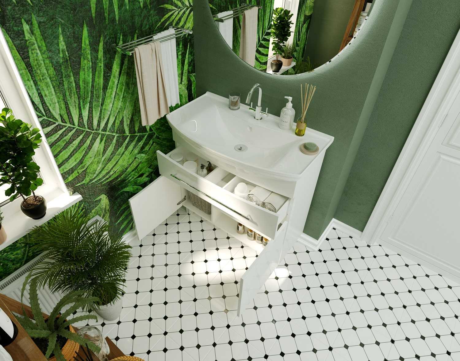 - Габаритная мебель с очень удобной и вместитльной системой хранения, которая прекрасно пододйет для большой семьи и универсально впишется в любой интерьер ванны благодаря соврменному минималистичному дизайну.