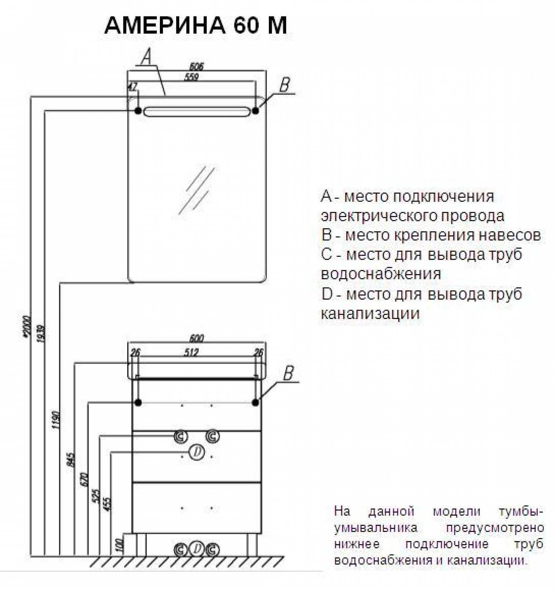 Дополнительная комплектация: Раковина накладная Aquaton Тигода 60 470х600х210 (1WH302082), Раковина накладная Aquaton Дрея 60 470х600х90 (Dreja-60), Шкаф зеркальный Акватон Америна 60 белый глянец (1353-2(LEV)/1353-2(PRA)), Пенал подвесной Акватон Америна белый (1352-3), Пенал подвесной Акватон Америна белый глянец (1378-3) приобретаются отдельно.