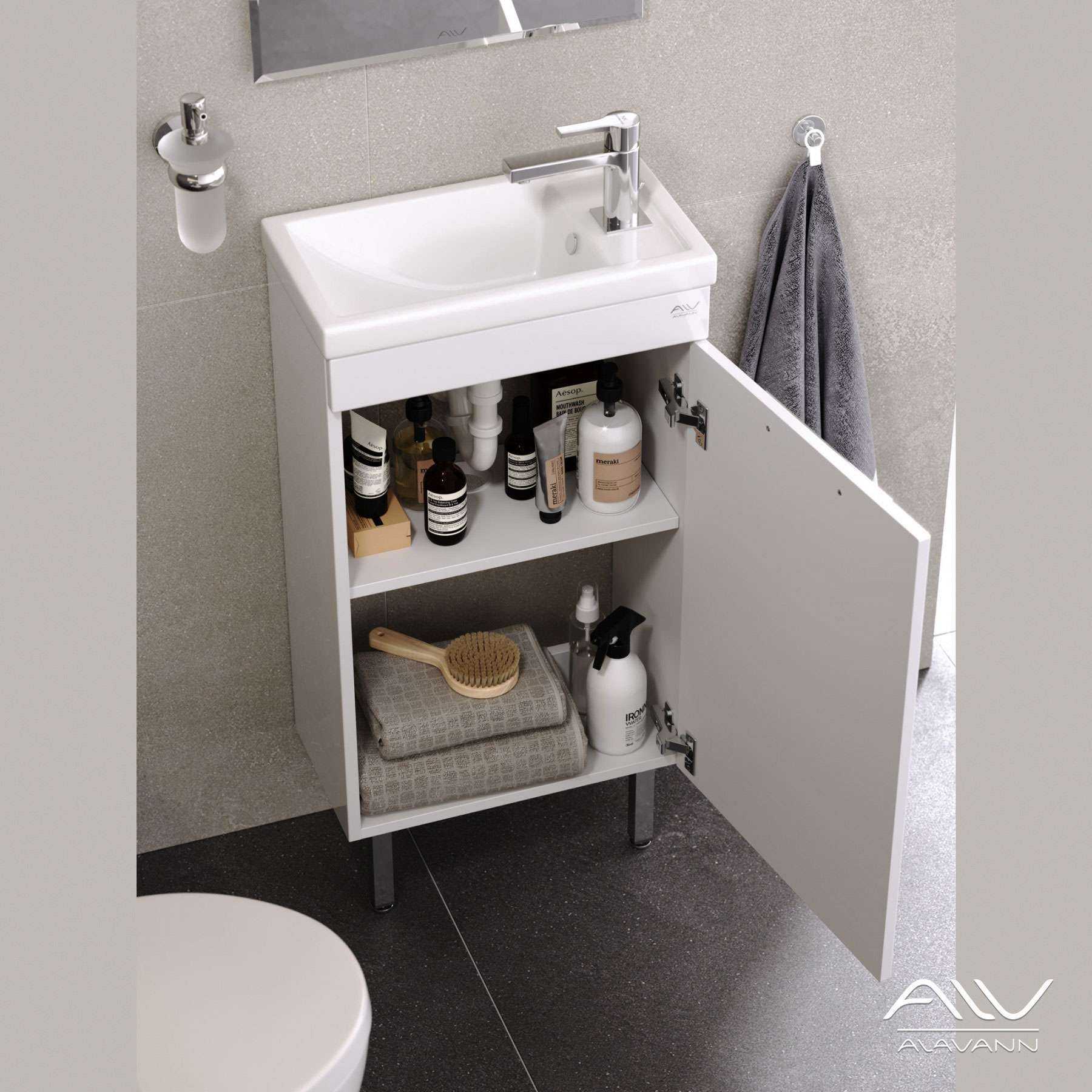 Несмотря на компактность (размер тумбы Азорро - 45 см), она прекрасно вмещает все необходимое за счет рациональной организации внутреннего пространства. Внутри одна полка с возможностью перестановки. В тумбе уже предусмотрено специальное отверстие для подвода коммуникаций.