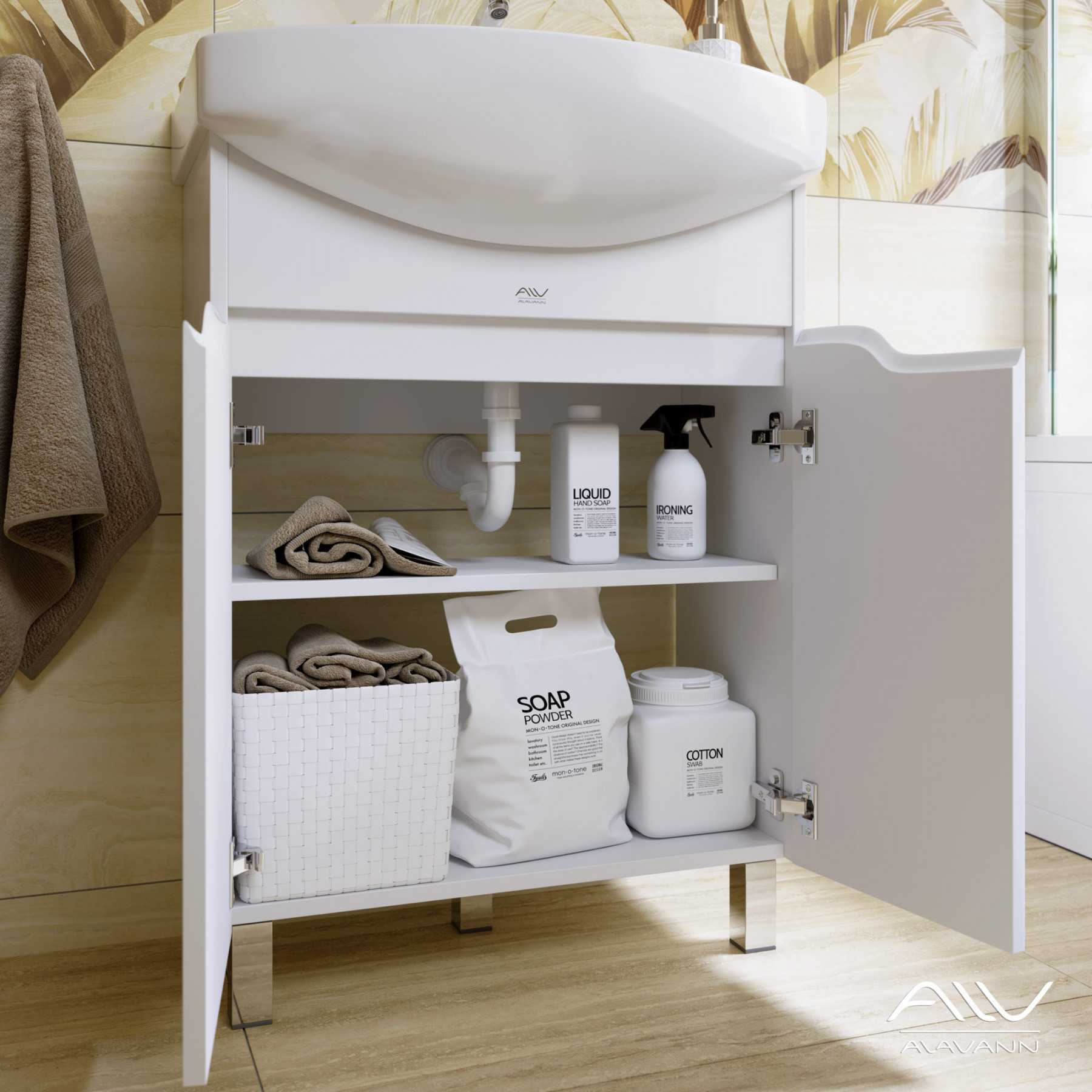 За горизонтальными фасадами тумбы Crystal расположена съемная полка, где можно разместить все необходимые принадлежности.