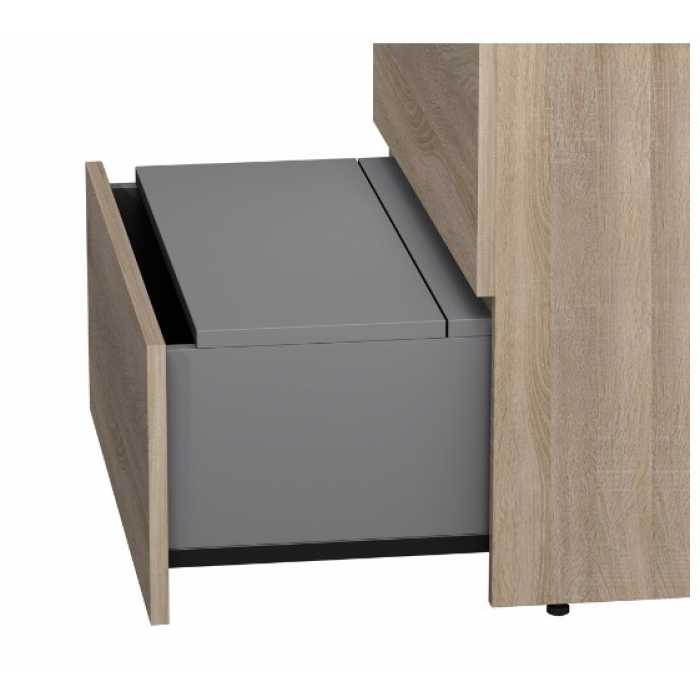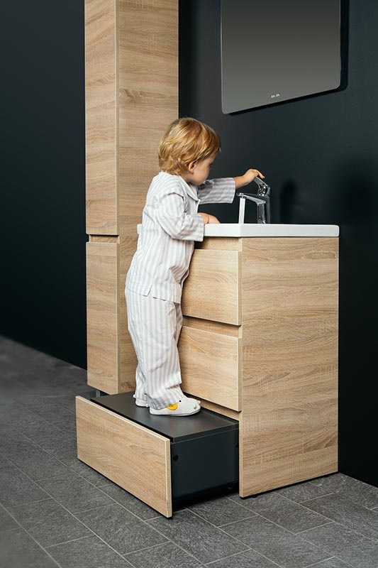 Уникальный нижний ящик базы может быть использован как: выдвижная подставка для детей для удобного мытья рук (выдерживает нагрузку до 60 кг) дополнительная ниша для хранения (экономия пространства ванной комнаты). Ящики с антискользящим покрытием цвета антрацит – европейский стандарт.