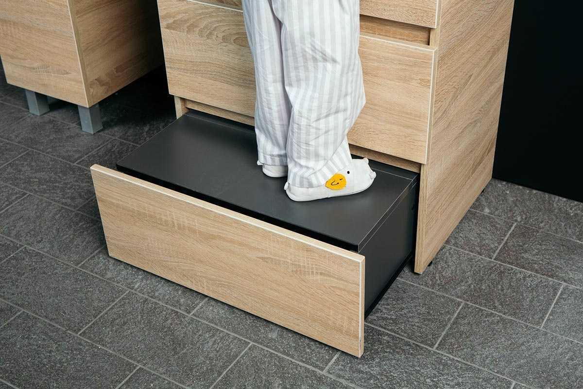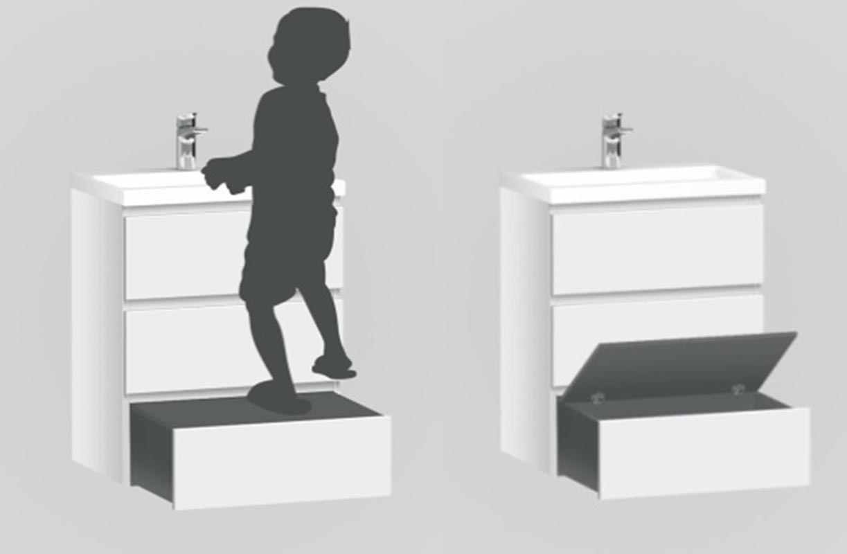 Уникальный нижний ящик базы может быть использован как: выдвижная подставка для детей для удобного мытья рук (выдерживает нагрузку до 60 кг) дополнительная ниша для хранения (экономия пространства ванной комнаты). Ящики с антискользящим покрытием цвета антрацит – европейский стандарт.