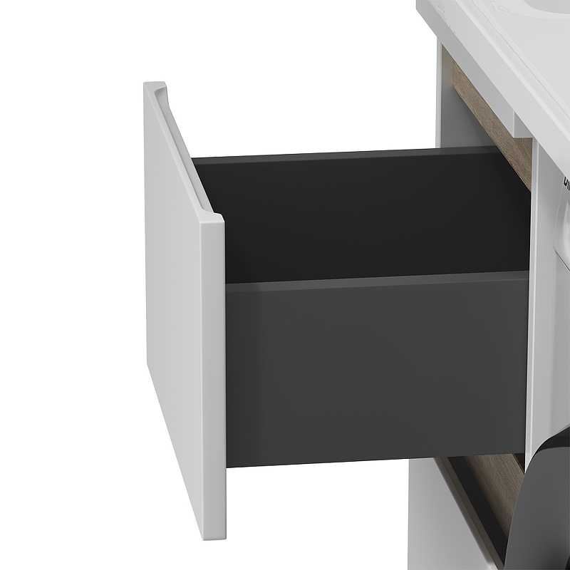 Глубокие удобные ящики позволяют организовать и хранить все необходимые средства под рукой. Внутреннее покрытие каждого ящика выполнено в современном цвете Anthracite и имеет противоскользящее покрытие. Накладная раковина из литьевого мрамора белоснежного цвета оснащена съемной мыльницей специальным бортиком для защиты от пролива воды за мебель и скрытым сливом.