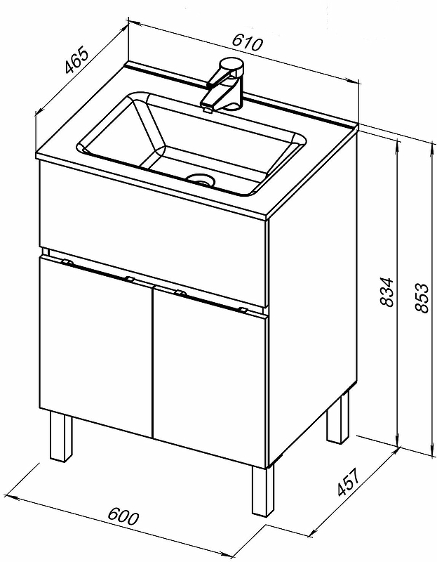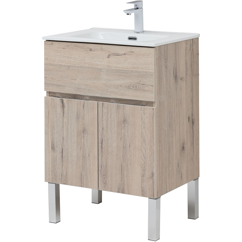 Тумба Aquanet «Алвита» New 60 — напольная модель, которая устанавливается на четыре ножки. Верхняя часть оснащена широким ящиком с потайной ручкой. Внизу располагается одна полка, которая закрывается двумя дверцами с доводчиками. Ее можно использовать для хранения емкостей со стиральными порошками и гелями. Корпус и фасады изготовлены из ЛДСП. Материал характеризуется устойчивостью к высокой влажности благодаря покрытию фактурой цвета «дуб веллингтон белый». Габариты — 600х457х834 мм. Раковина сделана из керамики, дополнена отверстием для крана, широкими бортиками по периметру. На них можно удобно расставлять гигиенические принадлежности. В комплекте с тумбой органично будет смотреться пенал Aquanet «Алвита» New 35. К мойке подойдут смеситель с хромированным покрытием (артикул 5.21001-00) и черный матовый донный клапан (артикул 5.21026-31).