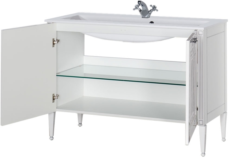 Тумба c раковиной Aquanet Паола в популярном стиле неоклассика, сочетающем изящество классических форм с передовыми технологиями и современными материалами. Распашные дверки фасада тумбы движутся плавно и бесшумно, поскольку крепятся на петлях с плавным доводчиком. Лицевая фурнитура комплекта &mdash, совместное производство российского производителя Валмакс и итальянского разработчика мебельной фурнитуры Sagittario. Изящные ручки высокого качества устойчивы к воздействию влаги и истиранию. Тумба комплектуется изящной и удобной раковиной из литьевого мрамора — материала с уникальными свойствами, превосходящего по многим характеристикам обыкновенный природный мрамор. Вариант внутренней полки из ударопрочного стекла соответствует современному тренду в производстве мебели для ванных комнат.