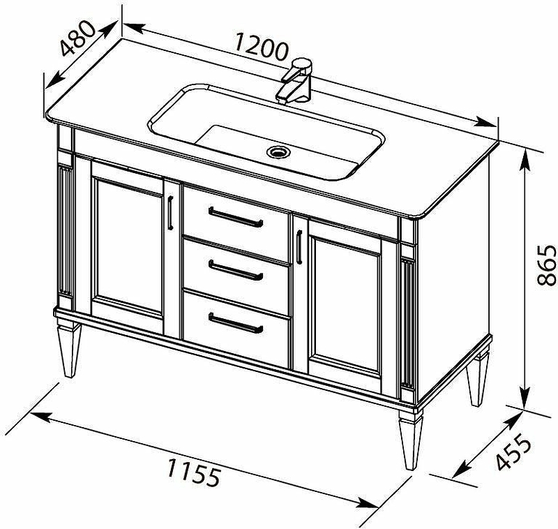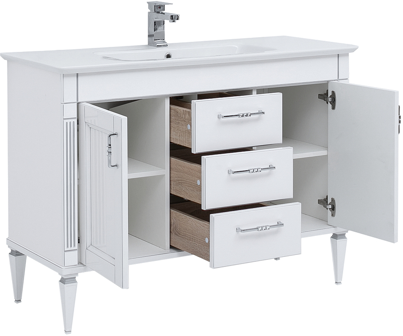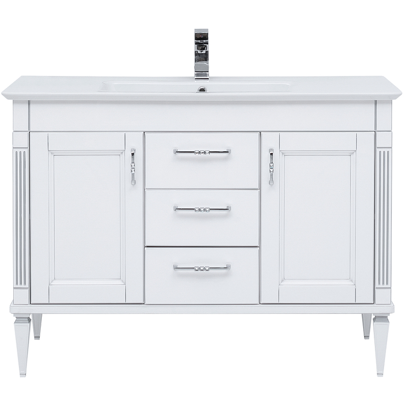 Тумба с раковиной Aquanet Селена 120 белый/серебро с эффектным патинированием серебром, с живописными украшениями в виде искусной фрезеровки по фасадам и корпусу, с замысловатыми ручками, украшенными кристаллами Swarovski, впечатляет с первого взгляда. Это яркий образец классической мебели. Тумба шириной 105 см выполнена с двумя распашными дверцами, за каждой из которых скрывается по две полочки, и три выдвижных ящика между ними. Для модели подобрана новинка из ассортимента турецкого производителя Sanovit - керамическая накладная раковина из коллекции Sharp. Ее отличает тонкий изящный край, широкие борта, которые вполне могут стать подобием полочки для размещения средств ежедневной гигиены. Тумба предназначена для напольной установки. Причем, ножки, на которые она устанавливается, также являются декоративным элементом, так как изящно выточены и имеют фрезеровку. Фасады изделия выполнены из МДФ и покрыты эмалью, а корпус – из влагостойкой ДСП. Петли и направляющие в шкафчиках немецкого производства фирмы Hettich. Для удобства использования все направляющие снабжены доводчиками.