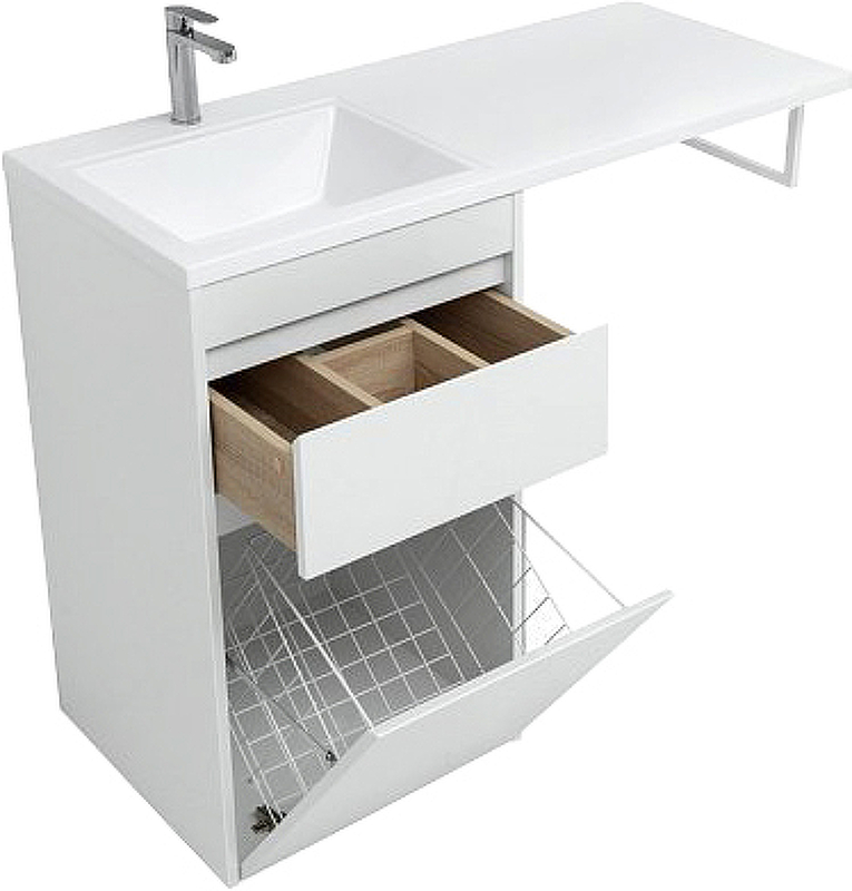 Тумба с раковиной Aquanet Токио 110 белого цвета представляет новый формат тумб производства Aquanet. Раковина из литьевого мрамора имеет длинную платформу, которая выходит далеко за пределы тумбы. Она предназначена для того, чтобы установить с правой стороны от тумбы стиральную машину. Платформа имеет такую длину, которая позволит спрятать под нее машинку средних размеров с фронтальной загрузкой. Корпус тумбы выполнен из влагостойкого ЛДСП, а фасады – из МДФ с покрытием эмалью. Две зоны хранения в тумбе шириной 480 мм - это выдвижной ящик с доводчиками для хранения важных мелочей и откидная дверка с закрепленной на ней бельевой корзиной. Тумбу можно использовать и без соседства со стиральной машиной, а свободное пространство под платформой раковины занять подкатной тумбой, приспособлениями для уборки помещения или столиком.