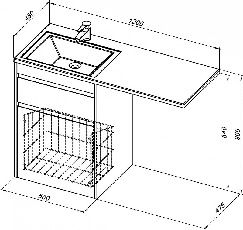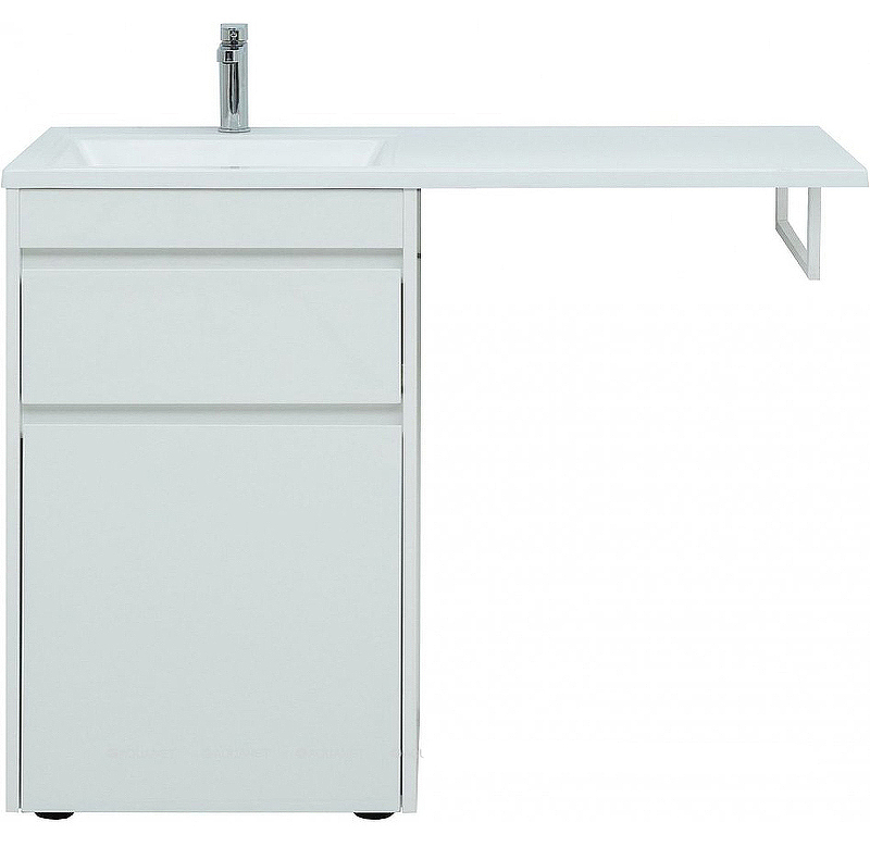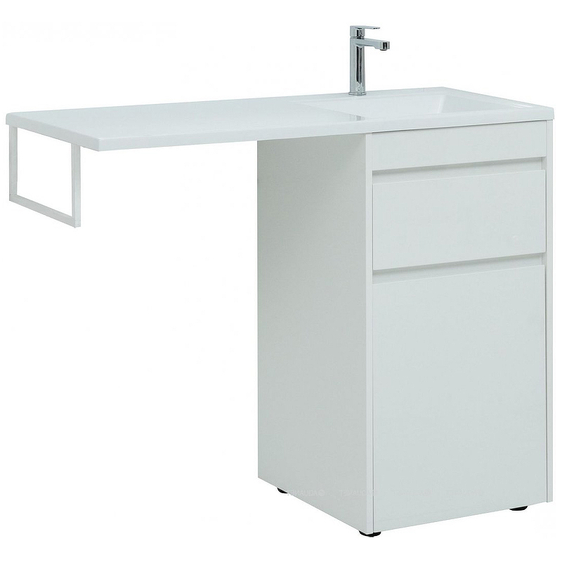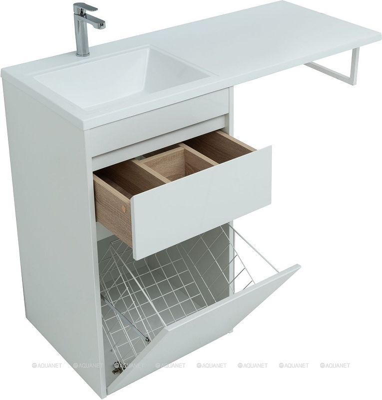 Напольная тумба с раковиной Aquanet Токио 120 белого цвета представляет новый формат тумб производства Aquanet. Раковина из литьевого мрамора имеет длинную платформу, которая выходит далеко за пределы тумбы. Она предназначена для того, чтобы установить с правой стороны от тумбы стиральную машину. Платформа имеет такую длину, которая позволит спрятать под нее машинку средних размеров с фронтальной загрузкой. Корпус тумбы выполнен из влагостойкого ЛДСП, а фасады – из МДФ с покрытием эмалью. Две зоны хранения в тумбе шириной 580 мм - это выдвижной ящик с доводчиками для хранения важных мелочей и откидная дверка с закрепленной на ней бельевой корзиной. Тумбу можно использовать и без соседства со стиральной машиной, а свободное пространство под платформой раковины занять подкатной тумбой, приспособлениями для уборки помещения или столиком.