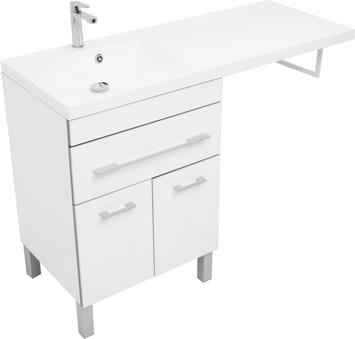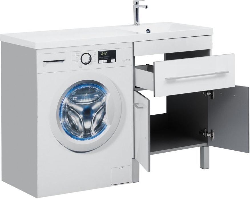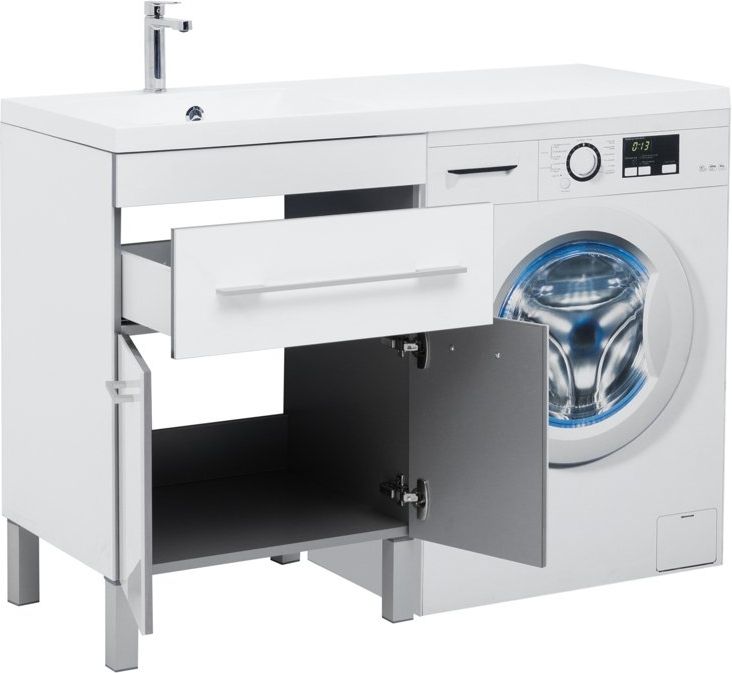 - Для удобства размещения гигиенических принадлежностей в тумбе предусмотрен выдвижной ящик с доводчиками и просторная секция, закрытая двумя распашными дверками.