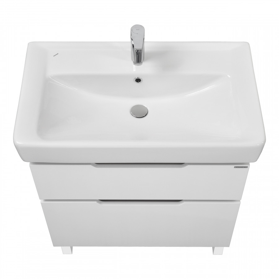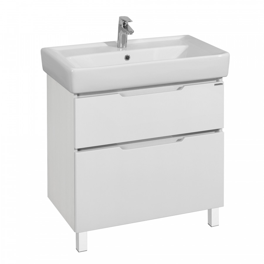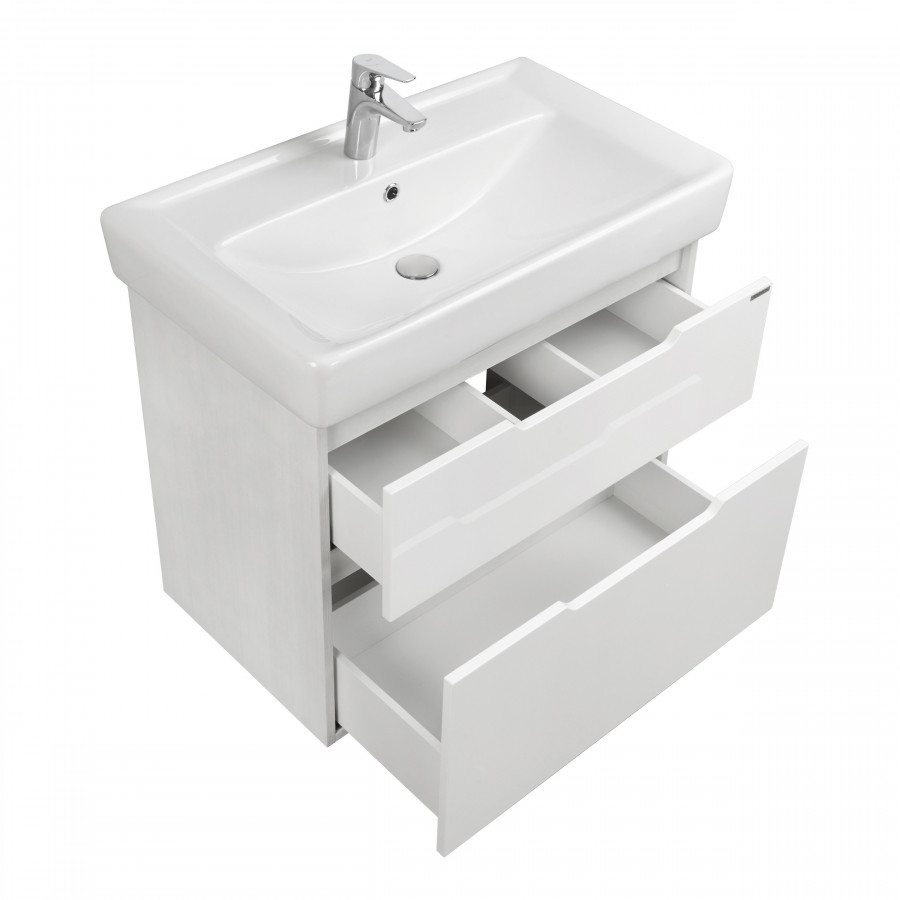 Стильная и современная тумба Дакота 80 идеально впишется в ванную комнату практически любого размера. Дизайн модели не предусматривает лицевую фурнитуру - вместо нее на фасадах сделаны удобные вырезы, которые позволяют без труда открыть ящики. Боковые стенки корпуса выполнены из текстурированной ДСП в цвете выбеленное дерево, а фасады тумбы, окрашенные в белый глянец, - из МДФ. Модель имеет два выдвижных ящика, оснащенных направляющими с интегрированной системой плавного закрывания, что обеспечивает дополнительное удобство при использовании.