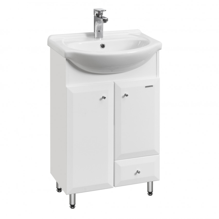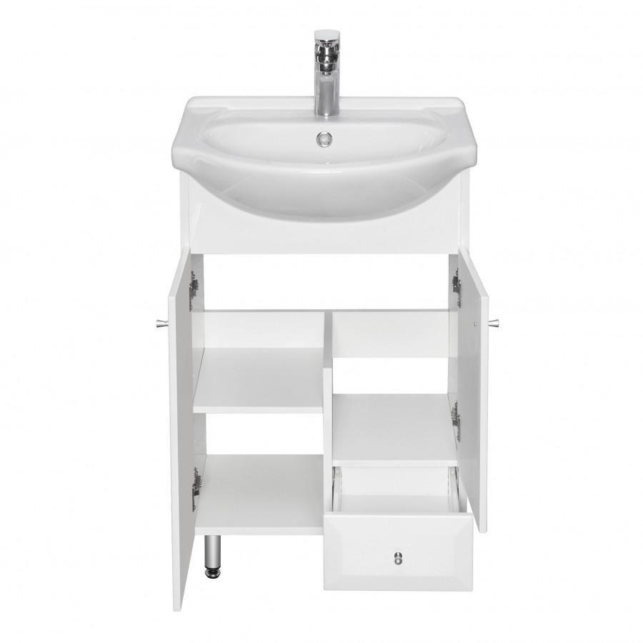 Компактная тумба под раковину Джимми 57 от AQUATON идеально подходит для небольших ванных комнат. Простая и лаконичная модель в белой глянцевой отделке выполнена из влагостойкой ЛДСП и МДФ, покрытых полиэфирной краской ультрафиолетового отверждения. Несмотря на компактные размеры, тумба предлагает достаточно места для хранения: за распашными фасадами установлена регулируемая по высоте полка, а в нижней части справа находится небольшой выдвижной ящик. Все тумбы комплектуются регулируемыми по высоте ножками.