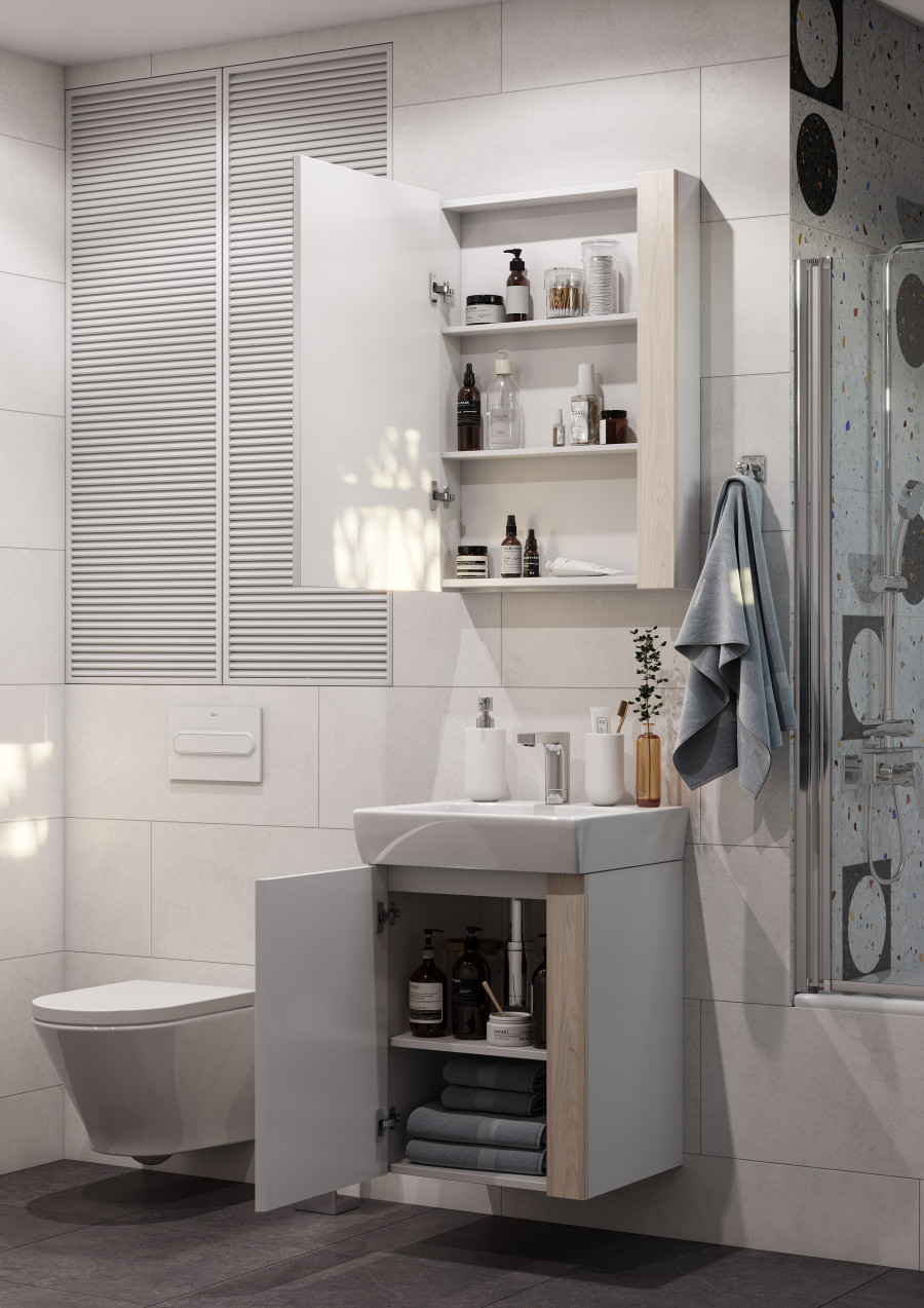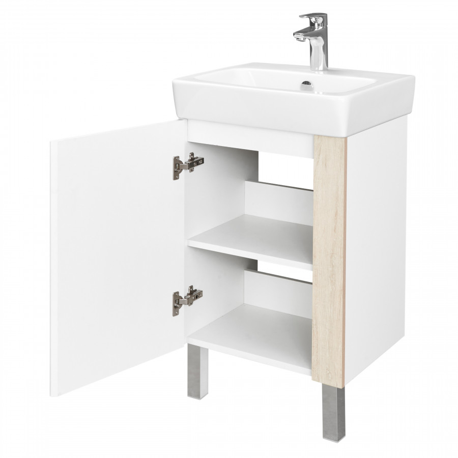 Лаконичная тумба Капри выполнена в современном дизайне: сочетание белого глянца (ВЛДСП в покраске) с древесным акцентом в цвете дуб верона (ламинированное влагостойкое ДСП). Все детали тумбы выполнены из влагостойкой ламинированной ДСП, предназначенной для использования в условиях ванной комнаты. Благодаря специальной обработке торца фасада под углом, открытие производится за створку. Универсальный функционал тумбы – распашная створка, за которой расположена полочка. Регулируемые опоры в комплекте.