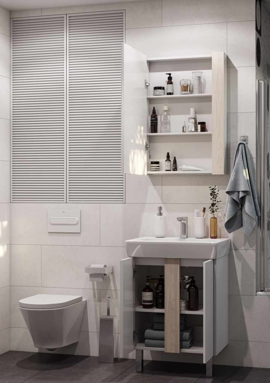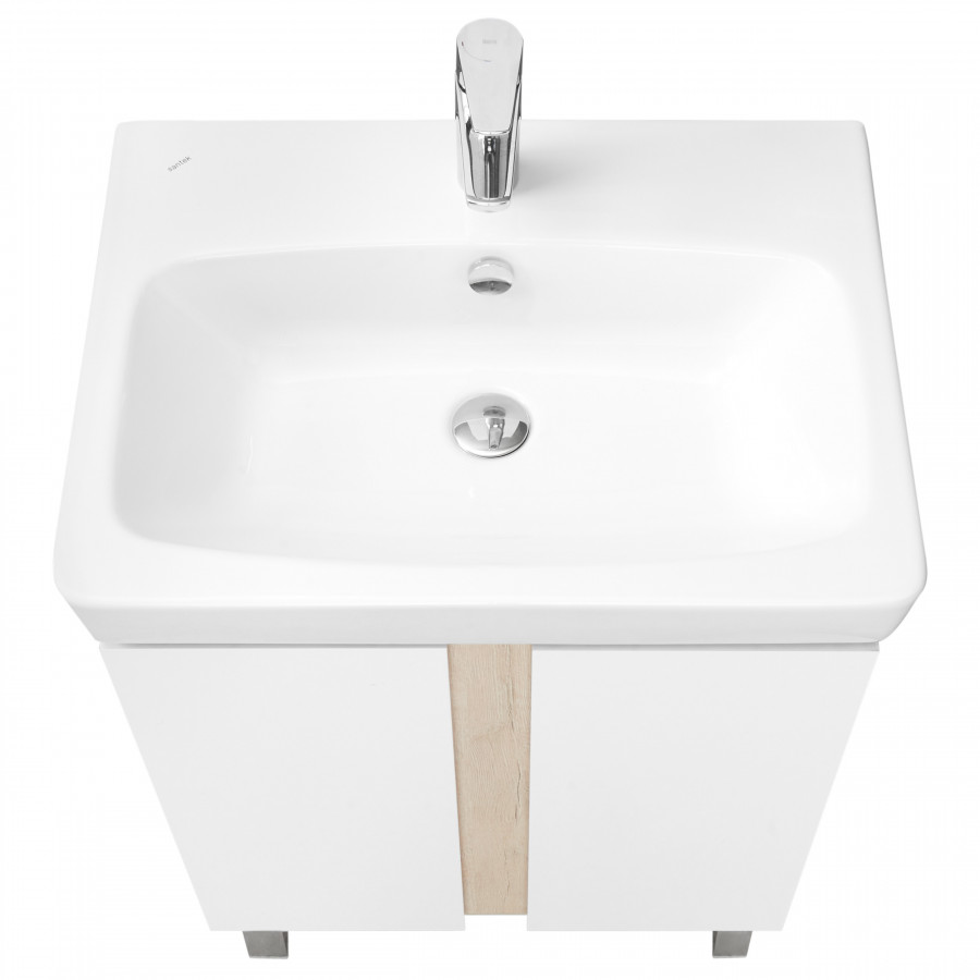 Лаконичная тумба Капри 60 выполнена в современном дизайне: сочетание белого глянца (ВЛДСП в покраске) с древесным акцентом в цвете дуб верона (ламинированное влагостойкое ДСП). Все детали тумбы выполнены из влагостойкой ламинированной ДСП, предназначенной для использования в условиях ванной комнаты. Благодаря специальной обработке торца фасада под углом, открытие производится за створку. Универсальный функционал тумбы – две распашные створки, за которыми расположена полочка. Регулируемые опоры в комплекте.