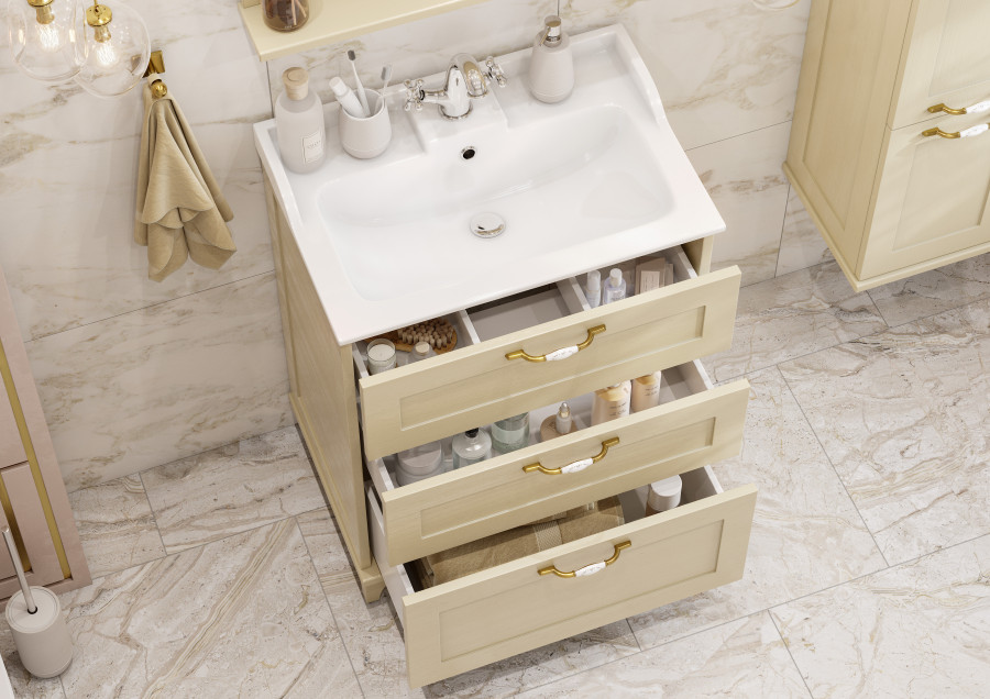 Подвесная тумба под раковину Леон 65 H от бренда AQUATON в благородной отделке белый дуб создана для любителей классического дизайна, но при этом предпочитающих современные материалы. Корпус и фасады выполнены из высококачественной МДФ, покрытой матовой пленкой. В тумбе установлены два ящика с системой плавного выдвижения и доводчиками. Классическую эстетику модели подчеркивают изящные ручки в отделке бронза от европейского производителя.