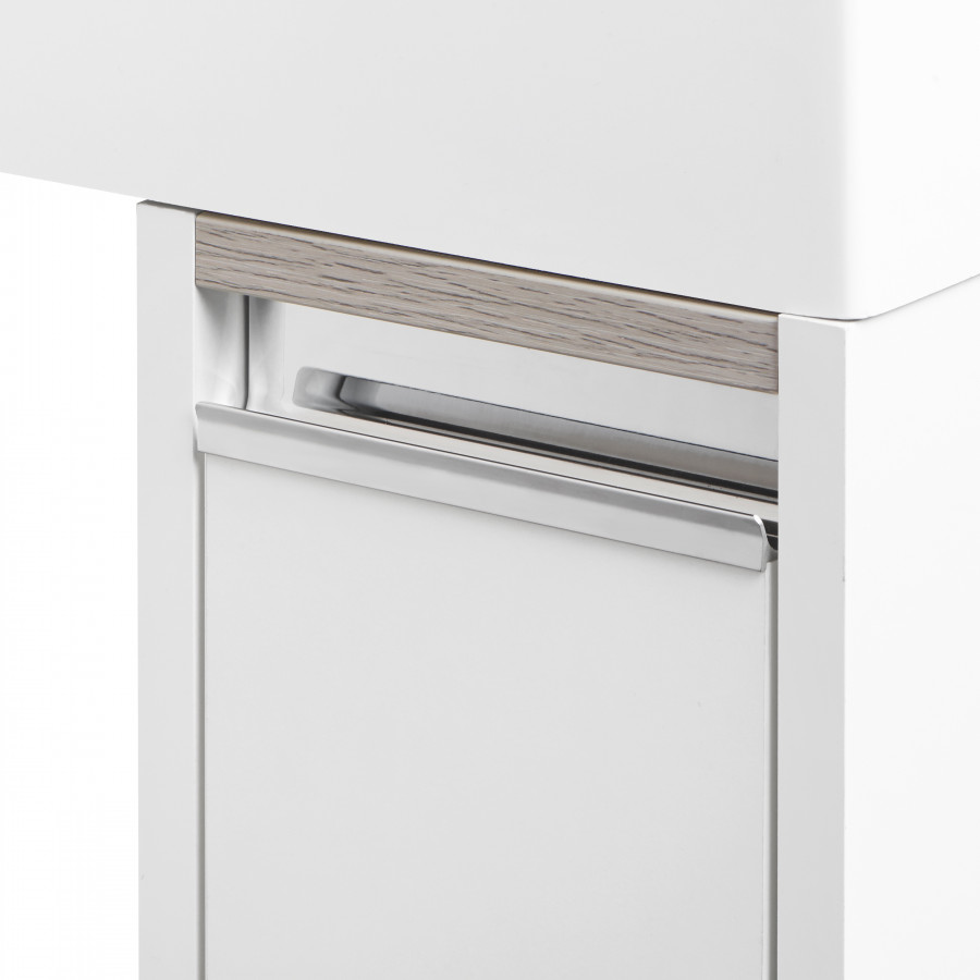 Тумба Лондри под стиральную машину выполнена из влагостойкой ламинированной плиты и окрашена в белоснежный цвет с высокой степенью глянца полиэфирной краской ультрафиолетового отверждения. Данный способ окрашивания обеспечивает изделию привлекательный внешний вид, а также износостойкость и долговечность. Ящик открывается с помощью изящной профильной хромированной ручки и состоит из двух отделений: верхнего и нижнего. Каждое отделение ящика выдерживает нагрузку до 20 кг. Над ручкой установлена вставка из влагостойкой ламинированной плиты благородного цвета дуб наварра. Тумба комплектуется раковиной Рейн 80 из прочного литого мрамора. Компактный размер данного комплекта подойдет для небольших ванных комнат и обеспечит место для хранения необходимых предметов и аксессуаров. Дополнительно к тумбе можно приобрести шкаф-колонну Лондри и зеркало c LED-подсветкой Соул 80.