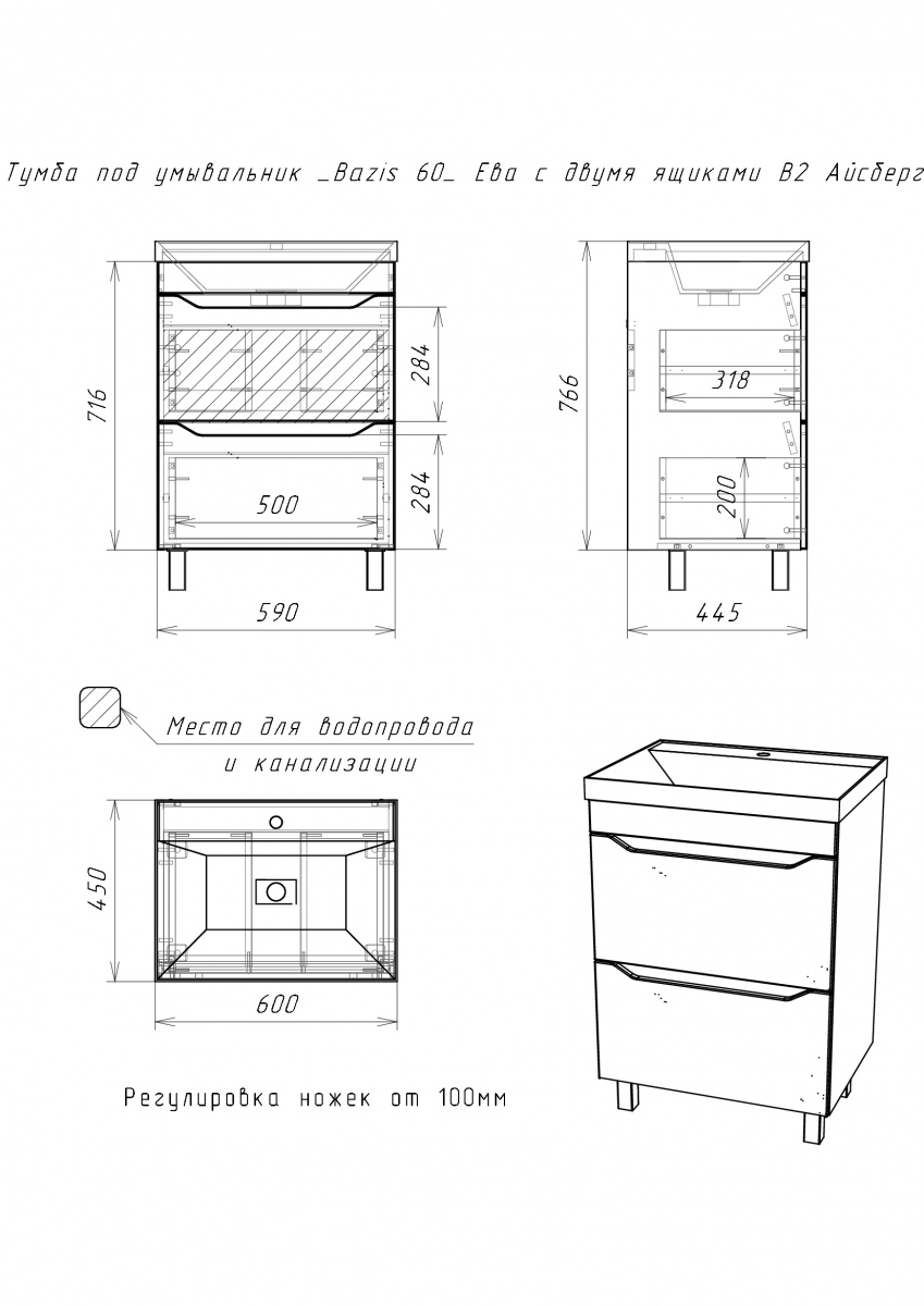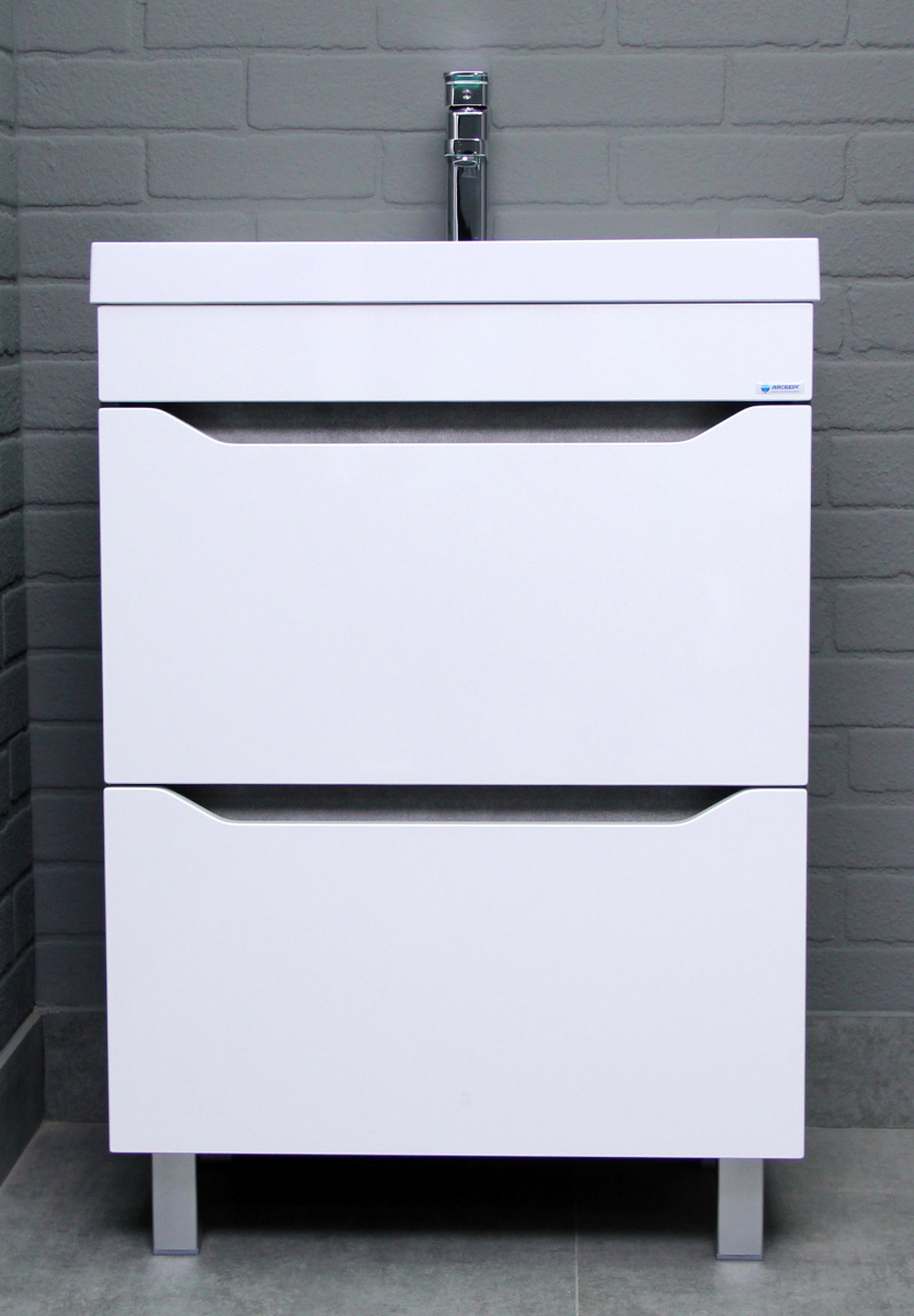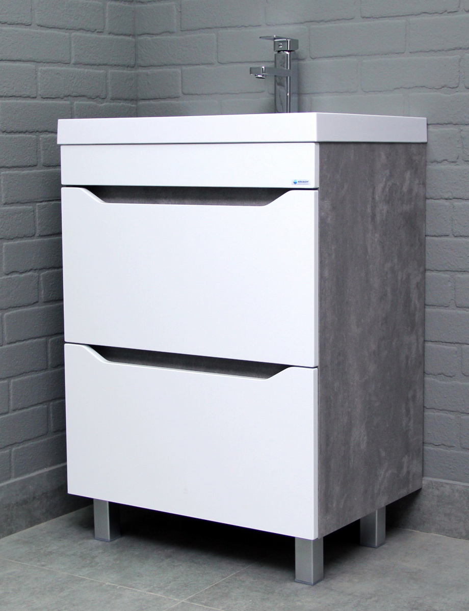 Тумба под умывальник ""Bazis 60"" Ева с двумя ящиками В2 Бетон Айсберг станет отличным дополнением для любой ванной комнаты. Тумбочка подходит для установки под раковину, обеспечивая удобство и стиль. Напольная конструкция позволяет легко разместить её в нужном месте, создавая гармоничное пространство.