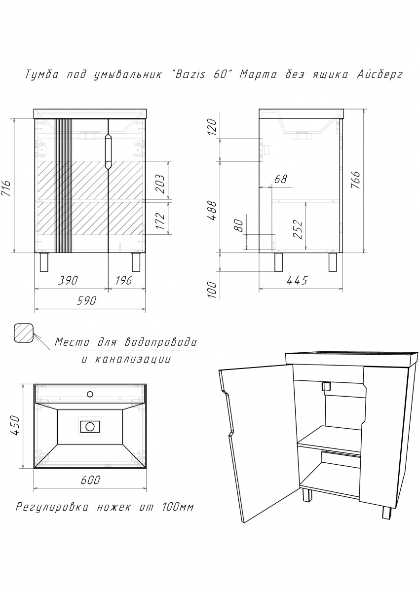 Тумба под умывальник ""Bazis 60"" Марта без ящика Айсберг станет отличным дополнением для любой ванной комнаты. Тумбочка подходит для установки под раковину, обеспечивая удобство и стиль. Напольная конструкция позволяет легко разместить её в нужном месте, создавая гармоничное пространство.