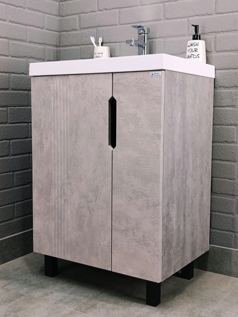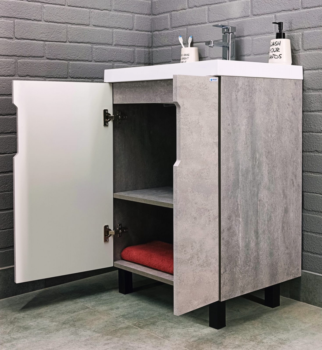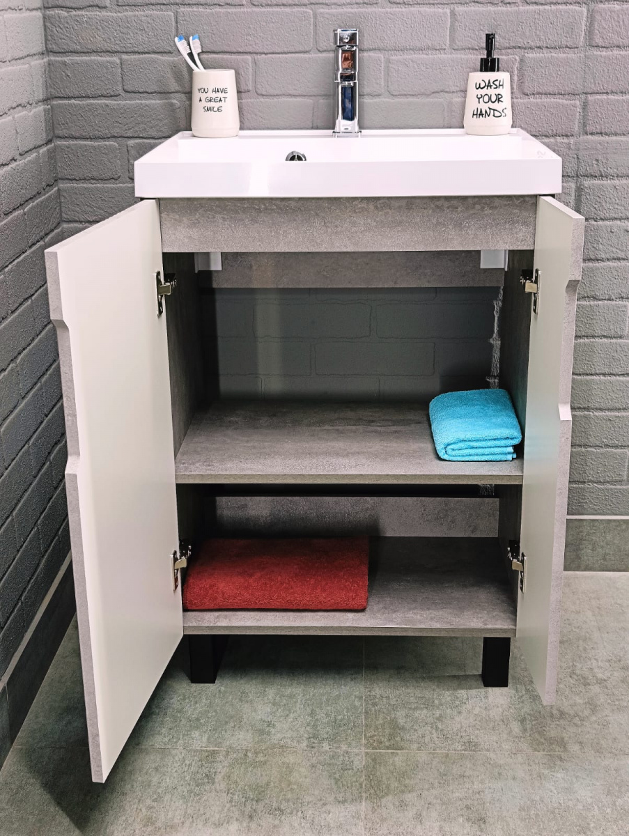 Тумба под умывальник ""Bazis 60"" Марта без ящика Бетон Айсберг станет отличным дополнением для любой ванной комнаты. Тумбочка подходит для установки под раковину, обеспечивая удобство и стиль. Напольная конструкция позволяет легко разместить её в нужном месте, создавая гармоничное пространство.