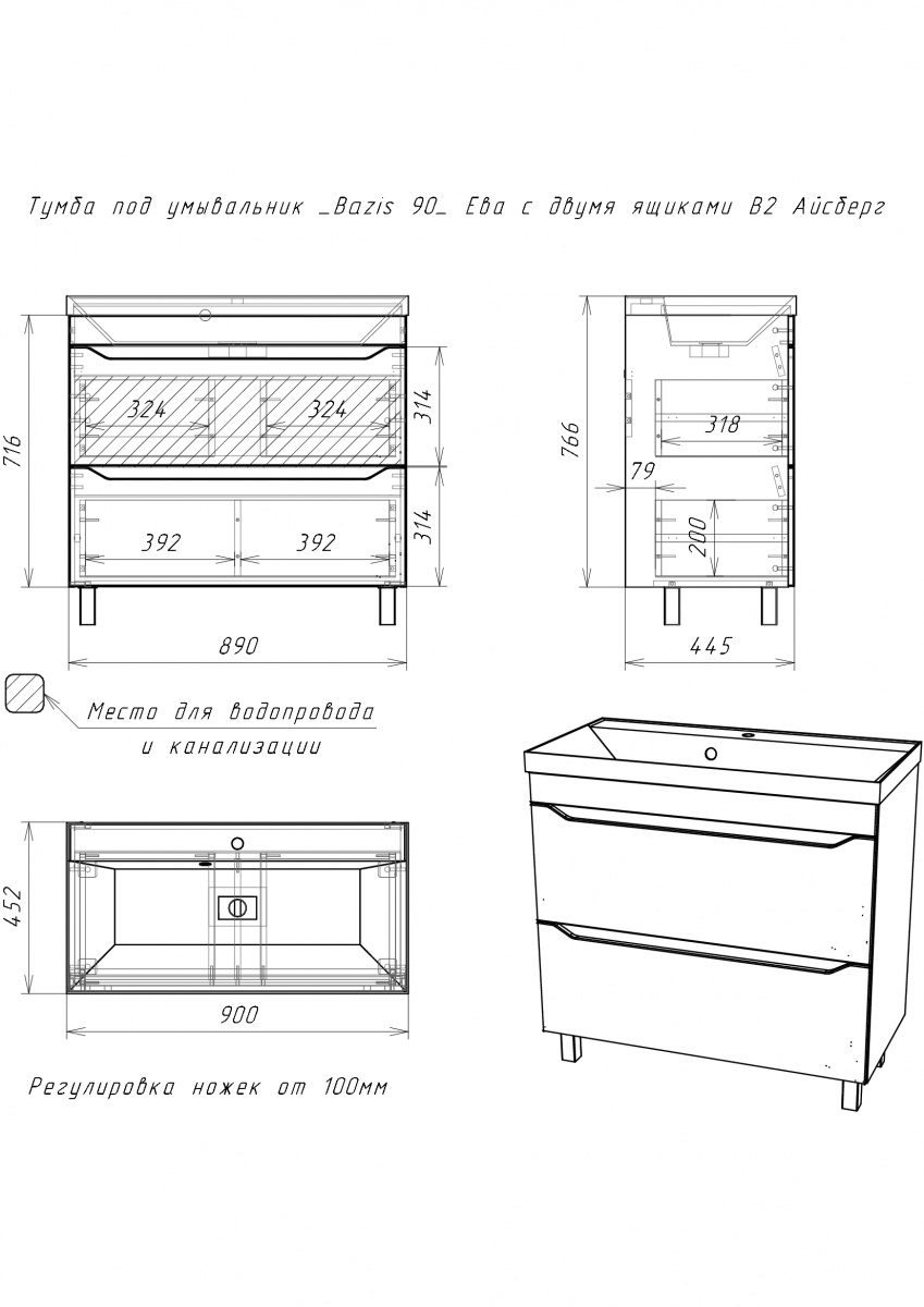 Тумба под умывальник ""Bazis 90"" Ева с двумя ящиками В2 Айсберг станет отличным дополнением для любой ванной комнаты. Тумбочка подходит для установки под раковину, обеспечивая удобство и стиль. Напольная конструкция позволяет легко разместить её в нужном месте, создавая гармоничное пространство.