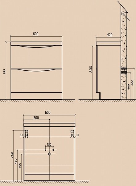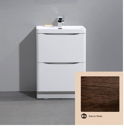 База под раковину напольная с двумя выкатными ящиками, с доводчиками (функция плавного закрывания). C врезной (фрезерованной) ручкой в плоскости фасада. Цвет: Rovere Moro (темный дуб).