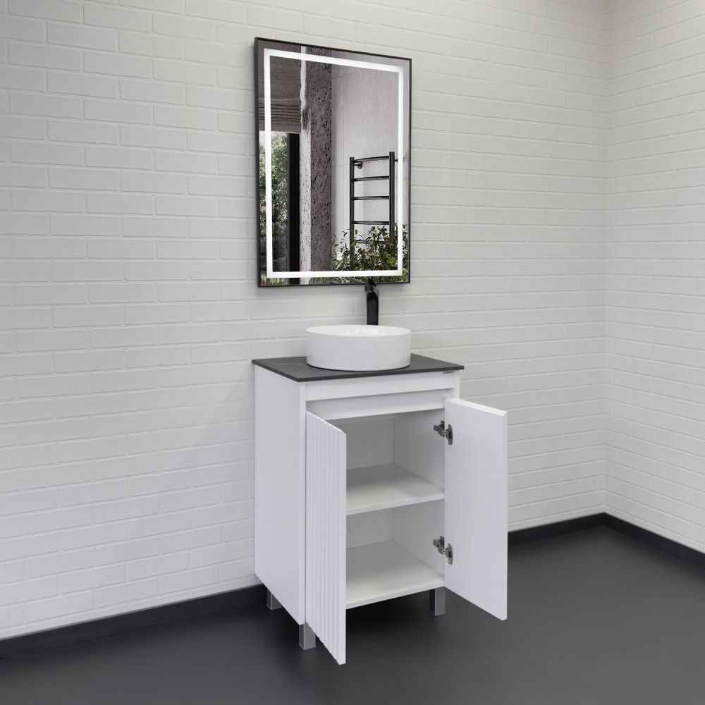 Фасад тумбы из МДФ фрезерован геометрическим узором с имитацией волны и окрашен белой матовой эмалью.
