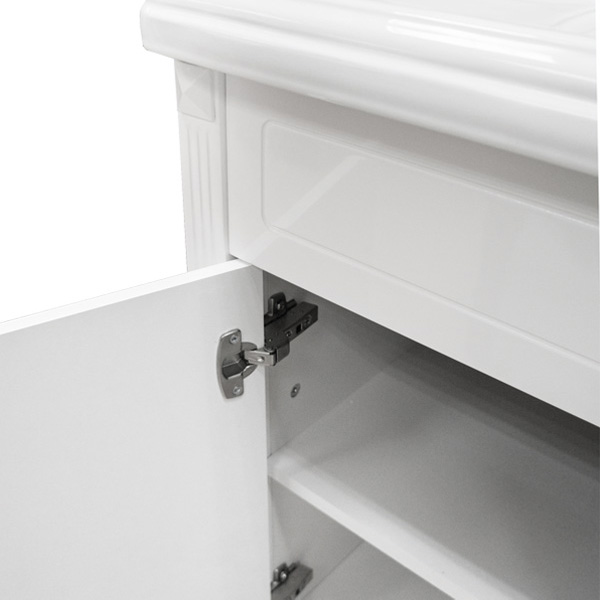 Широкая - 120 см - тумба-умывальник с двумя створками и двумя ящиками. Петли створок и направляющие ящиков оснащены механизмами плавного закрывания. Фасады с фрезеровкой, окрашены белой глянцевой эмалью. Ножки из массива дерева. За створками одна горизонтальная полка.