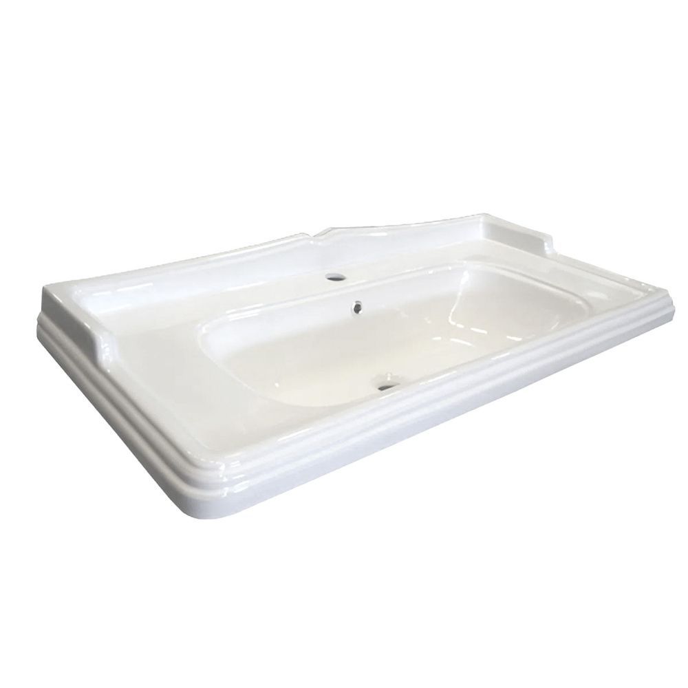 Напольная тумба-умывальник в неоклассическом стиле с широким выкатным ящиком с направляющими оснащенными системой плавного закрывания. Фасады выполнены из МДФ и покрыты белой глянцевой эмалью.