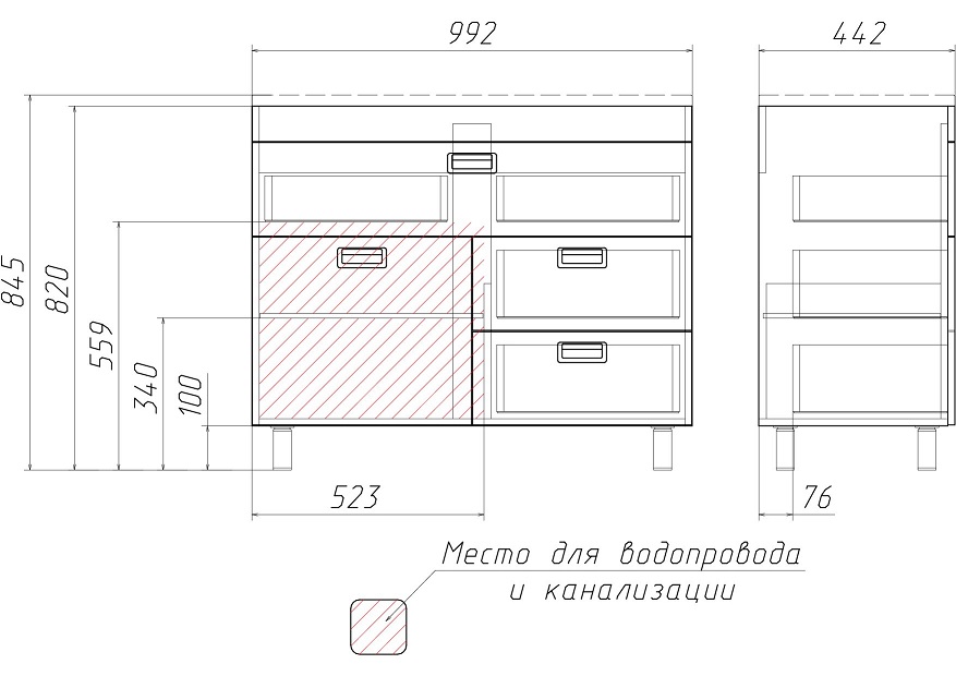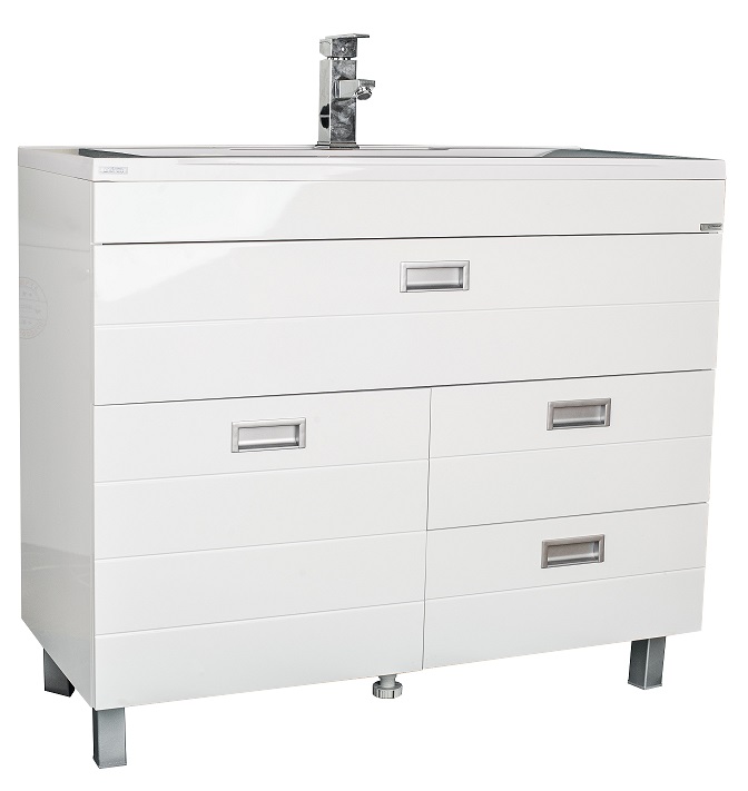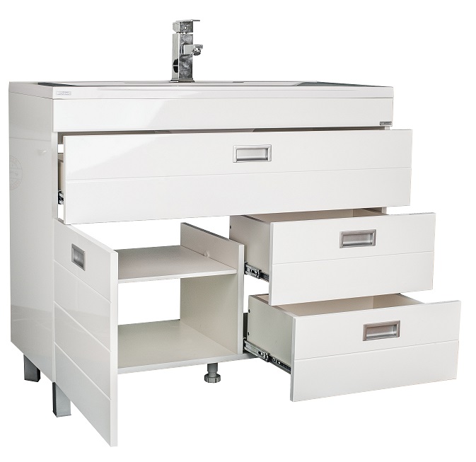 Тумба под умывальник CUBE 100 ELEN, шириной в один метр. В тумбе три выдвижных ящика и один отсек с дверцей. Тумба напольная.