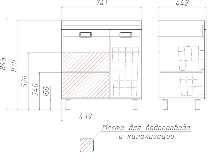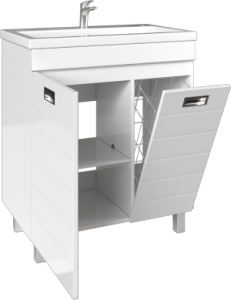 Тумба под умывальник CUBE 75 ELEN имеет два отсека, в одном место для туалетных принадлежностей, с полкой по середине, второй отсек предназначен для корзины для белья.