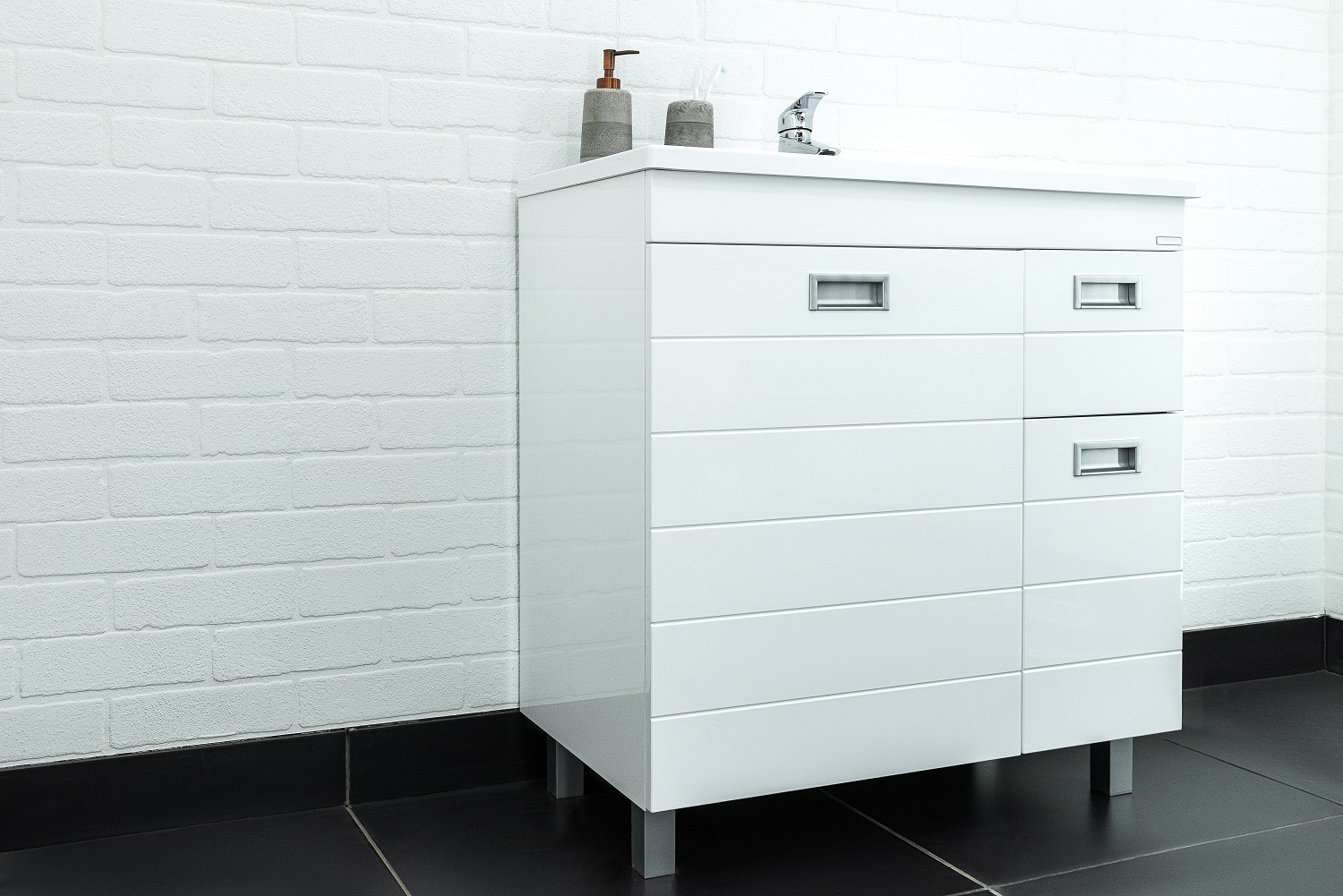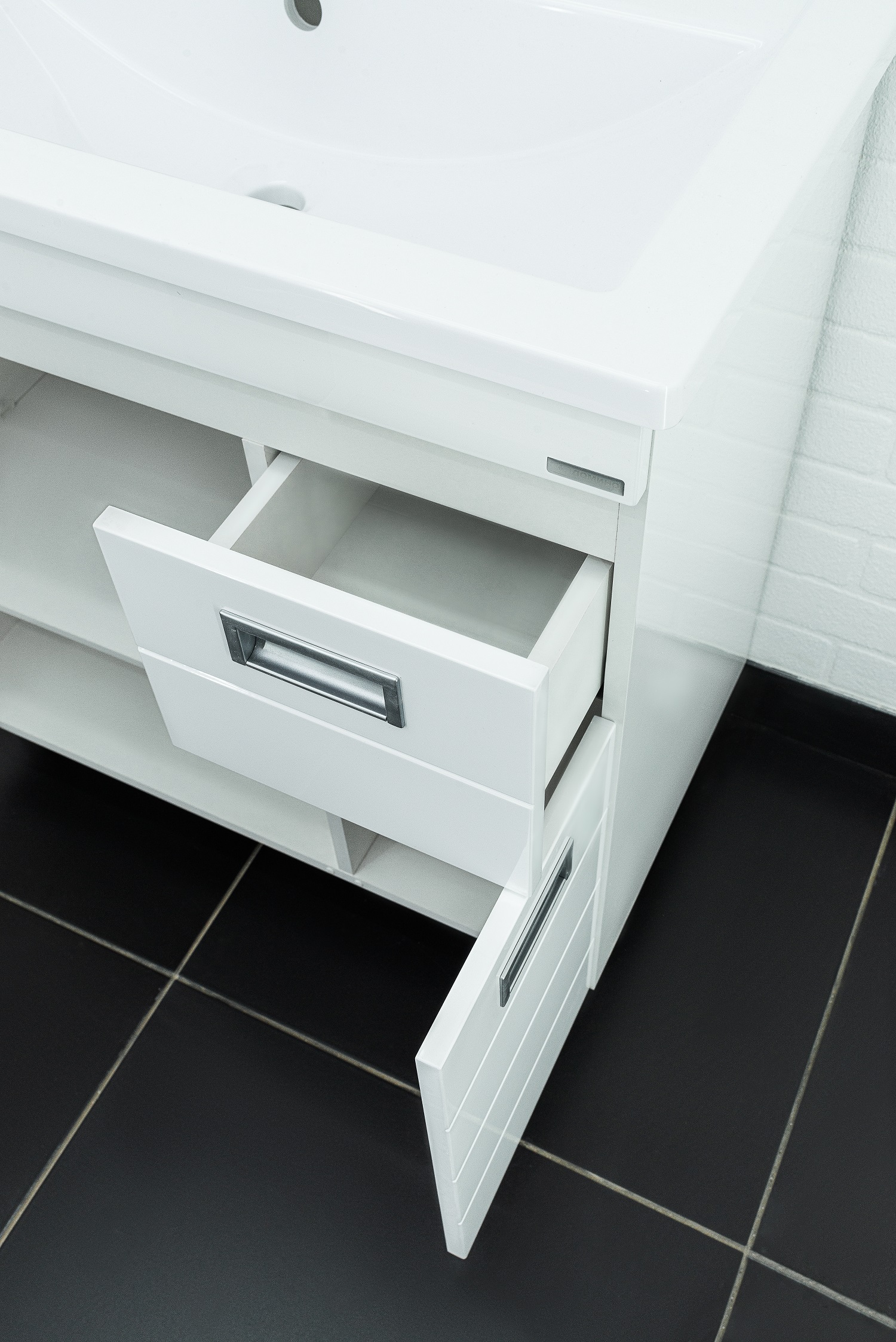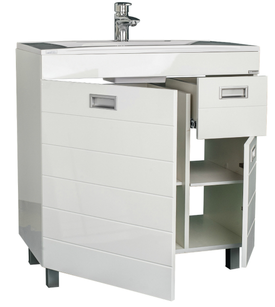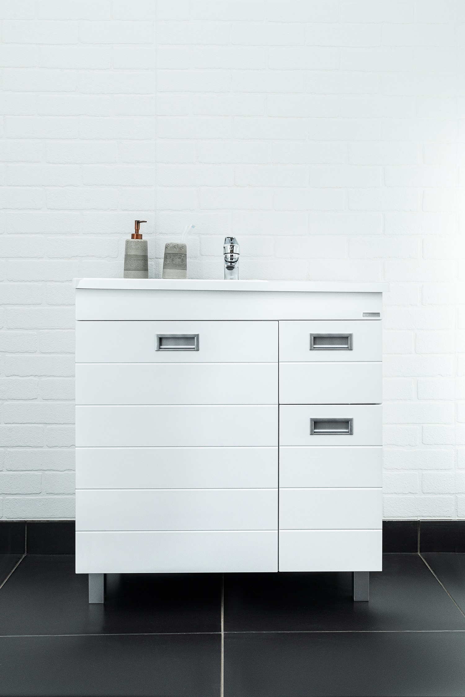 Напольная тумба под умывальник CUBE 80 ELEN имеет один большой отсек с дверцей и полкой по середине, второй поменьше, а также один выдвижной ящик.
