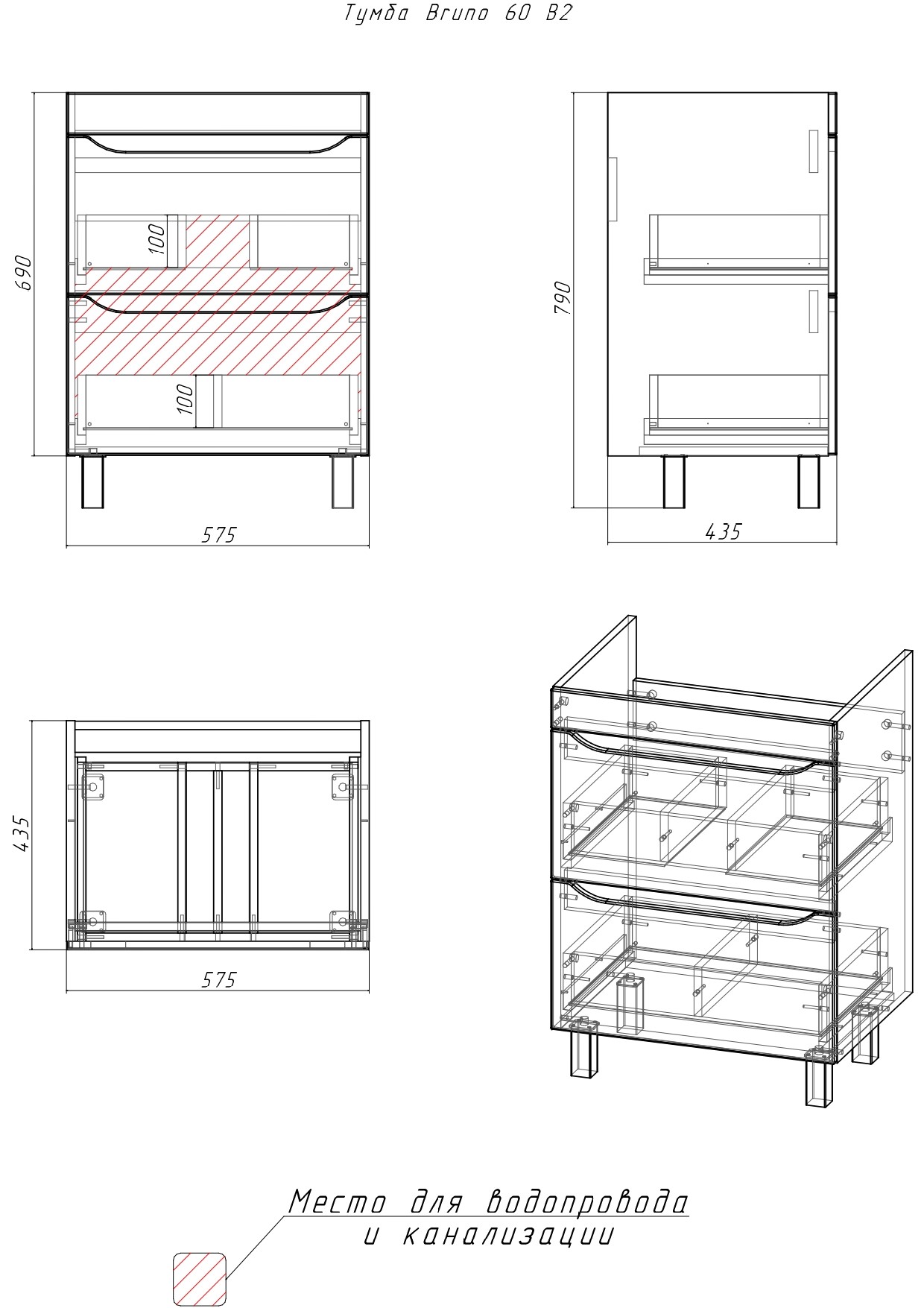 Тумба под умывальник "Енисей 60" Bruno с двумя ящиками