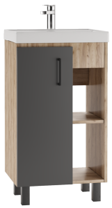 Корпус представлен в цвете «Дуб вотан» и выполнен из ЛДСП. Фасад из ЛДСП, покрыт пленкой ПВХ, цвета графит. Фурнитура черного цвета.