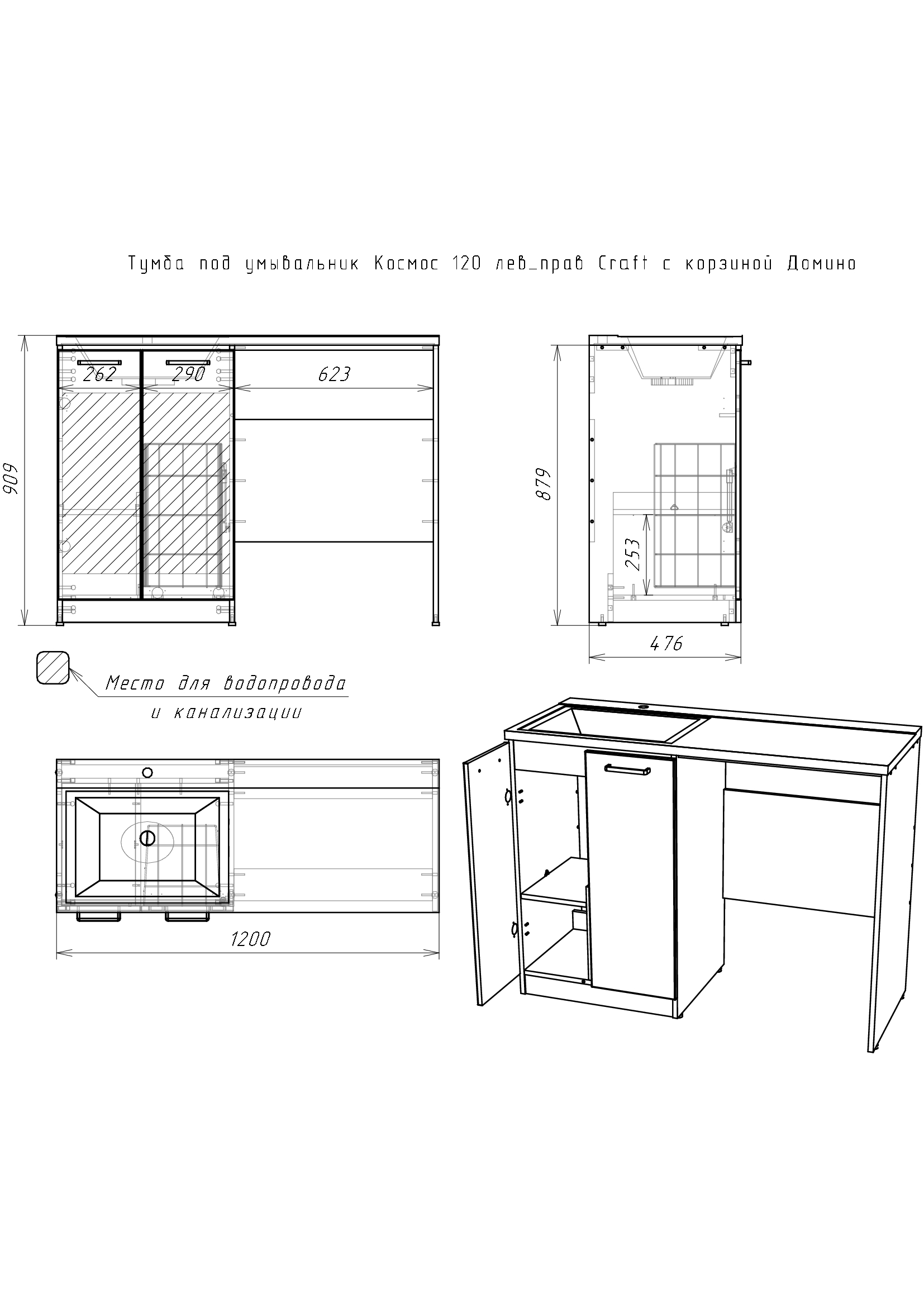 Тумба под умывальник Космос 120 Craft с корзиной, универсальный
