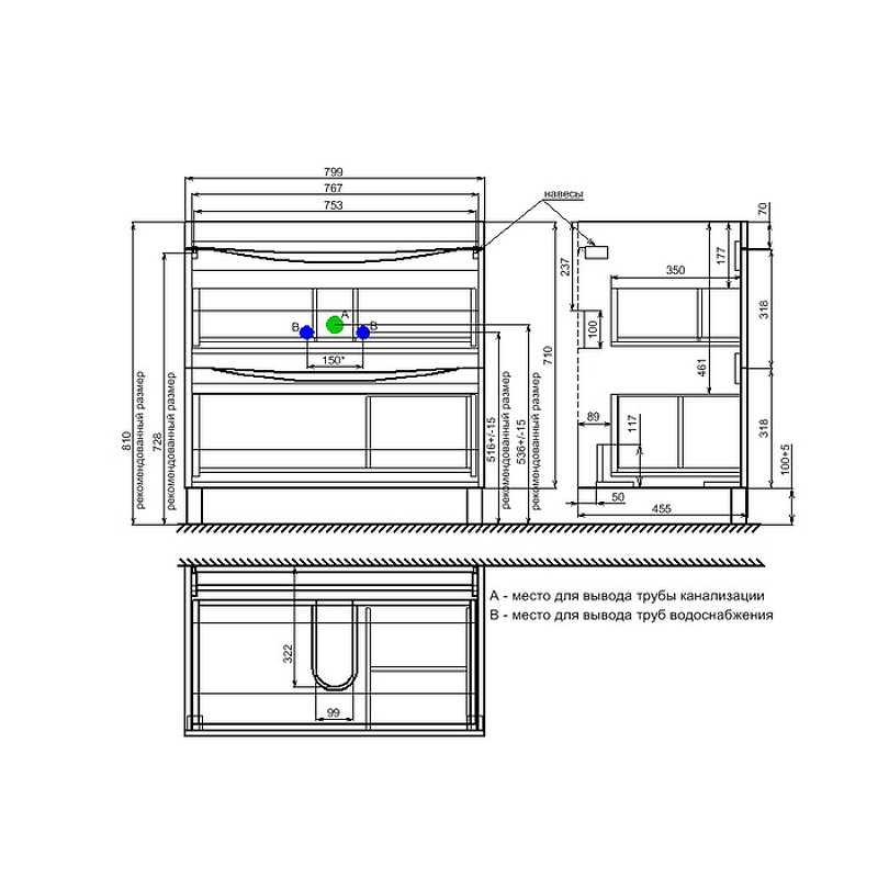 Оснащение: направляющие ящиков с механизмом плавного доведения.