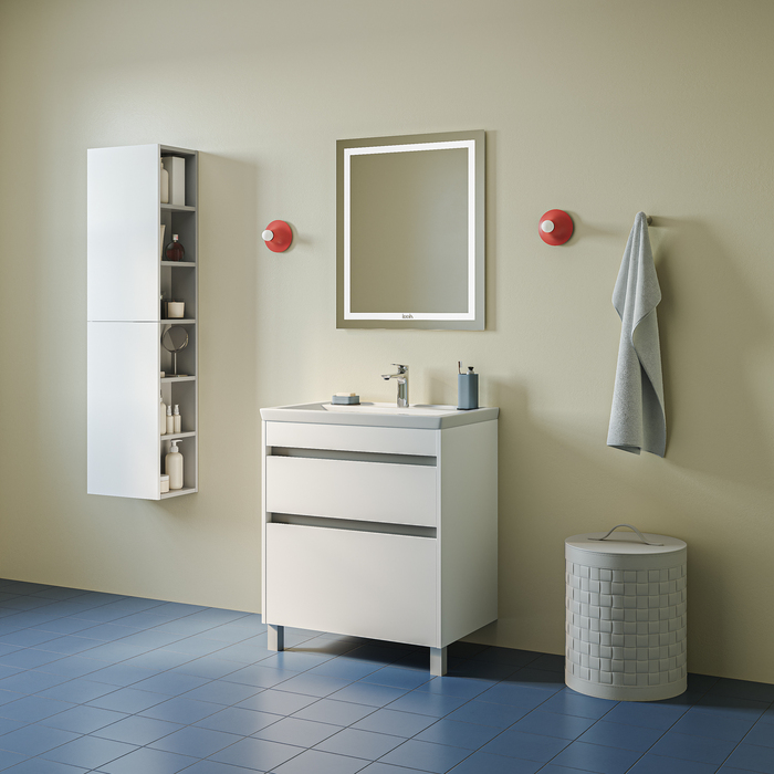 Тумба для ванной комнаты, напольная, белая. Размеры тумбы: 677*444*795 мм (ШхГхВ). Ножки 100 мм, хром. Материал фасада - МДФ 16 мм, материал боковин - ЛДСП 16 мм. Покрытие фасада: пленка ПВХ. Система хранения: 2 ящика. Система открывания: захват за фасад. Фурнитура: IDDIS, Hettich. Подходит умывальник 4077000i28.