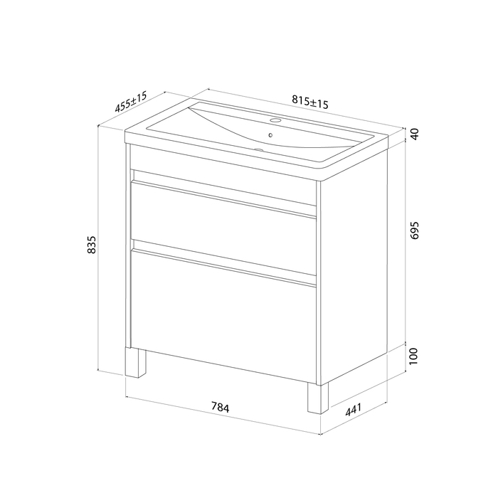 Тумба для ванной комнаты, напольная, белая. Размеры тумбы: 784*441*795 мм. Ножки 100 мм, хром. Материал фасада - МДФ 16 мм, материал боковин - ЛДСП 16 мм. Покрытие фасада: пленка ПВХ. Система хранения: 2 ящика. Система открывания: захват за фасад. Фурнитура: IDDIS, Hettich. Подходит умывальник 4078000i28.