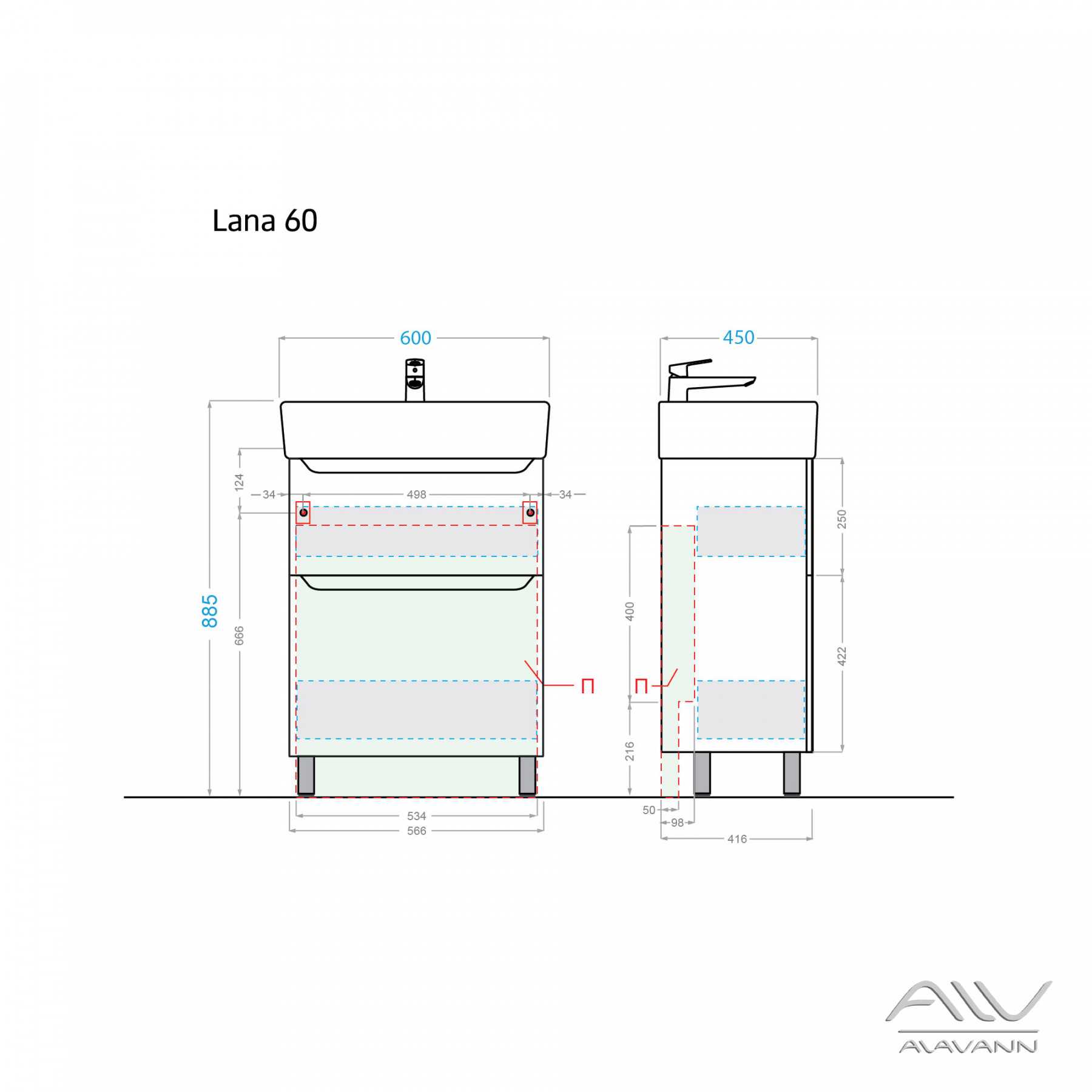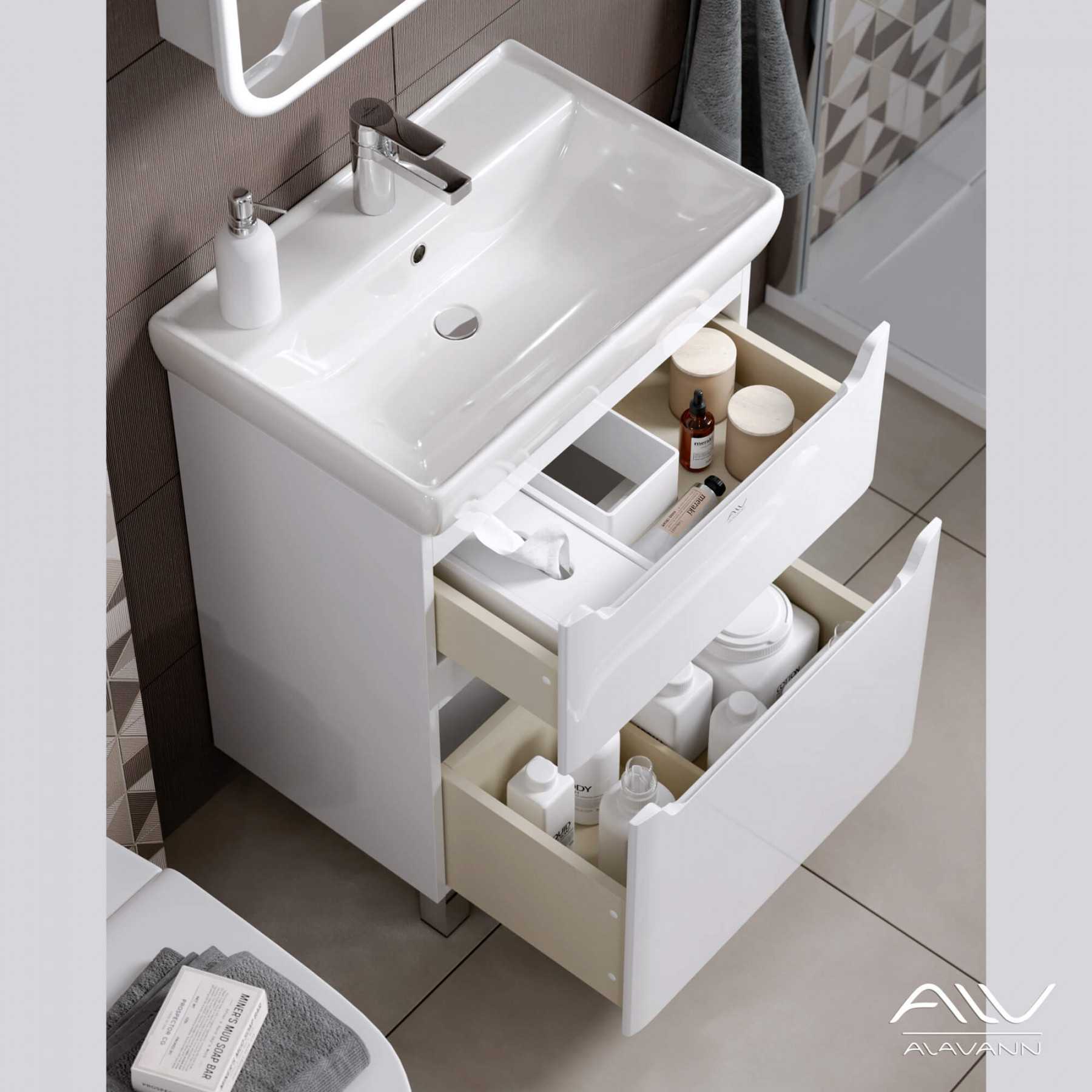 Корпус тумбы Lana изготовлен из ДСП, фасад - из МДФ. Все изделие покрыто влагостойкой белой глянцевой эмалью. Это гарантирует длительность эксплуатации тумбы в условиях повышенной влажности.