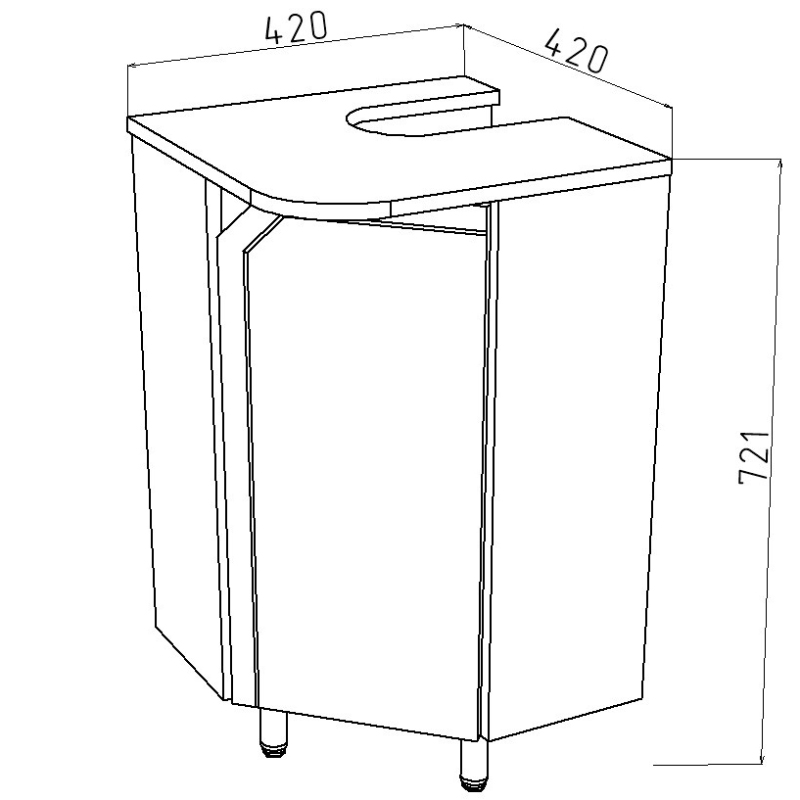 Напольная тумба Бета 40 торговой марки Melodia della vita с габаритными размерами 420х420х721 это современное и эргономичное решение для вашей ванной комнаты. Данная модель совместима с умывальником ROSA Элегия 45 (12080). Конструкция тумбы включает в себя корпус с одной распашной дверцей, сверху крышка с вырезом под раковину. У тумбы две металлические опоры и одна пластиковая. Вместо ручки - эргономичный спил под 45 градусов и фрезеровка подчёркивающая его. Поставляется в собранном виде в комплекте с крепежом и ножками. Умывальник приобретается отдельно.