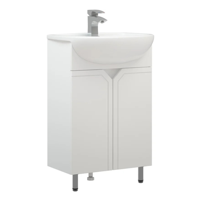 Напольная тумба Бета 65 торговой марки Melodia della vita с габаритными размерами 600х311х850 это современное и эргономичное решение для вашей ванной комнаты. Данная модель совместима с умывальником ROSA Элеганс 65 (89474). Конструкция тумбы включает в себя корпус с двумя распашными дверцами, позади полка. У тумбы две металлические опоры и одна пластиковая. Вместо ручки - эргономичный спил под 45 градусов и фрезеровка подчёркивающая его. Поставляется в собранном виде в комплекте с крепежом и ножками. Умывальник приобретается отдельно.