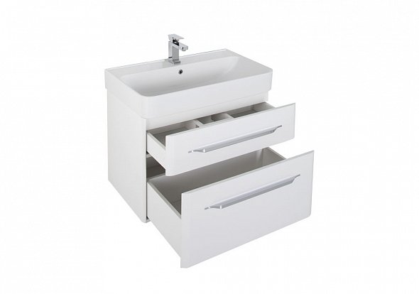Тумба Акванет Виченца 80 белого цвета смотрится уютно и по-домашнему. Ощущение легкости форм подчеркивает подвесная система монтажа тумбы – она будто парит над полом. В тумбе шириной 80 см два разных по глубине выдвижных ящика: в верхнем – три отделения под мелочь, нижний имеет размеры, позволяющие разместить самые разные бутылочки, флакончики и баночки. Тумбу венчает четырехугольная раковина, форма которой сочетает в себе изящные формы и тончайшие грани с плавностью линий. Благодаря доводчикам производства компании Hettich (Германия), открываются и закрываются дверцы и ящики плавно, спокойно и без неприятных звуков. Настоящим украшением тумбы служат эксклюзивные ручки производства турецкой компании System. Они выглядят очень изящно и стильно.