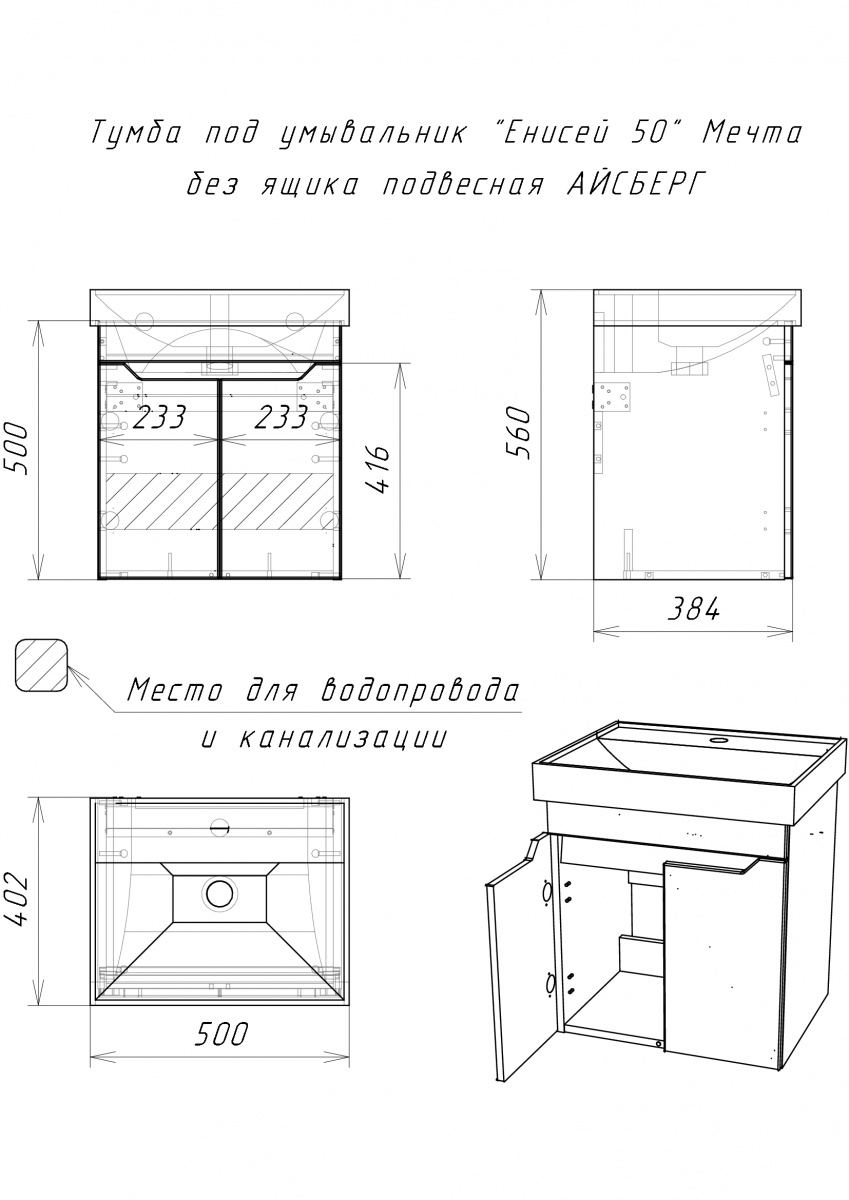 Тумба под умывальник Енисей 50 Мечта без ящика подвесная Бетон Айсберг Домино (DM2334T)