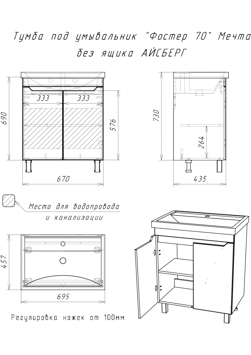 Тумба под умывальник ""Фостер 70"" Мечта без ящика АЙСБЕРГ станет отличным дополнением для любой ванной комнаты. Тумбочка подходит для установки под раковину, обеспечивая удобство и стиль. Напольная конструкция позволяет легко разместить её в нужном месте, создавая гармоничное пространство.
