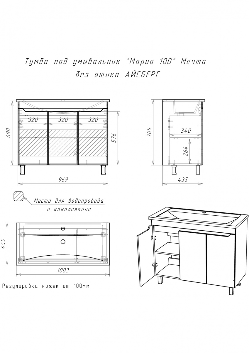 Тумба под умывальник ""Maria 100"" Мечта без ящика АЙСБЕРГ станет отличным дополнением для любой ванной комнаты. Тумбочка подходит для установки под раковину, обеспечивая удобство и стиль. Напольная конструкция позволяет легко разместить её в нужном месте, создавая гармоничное пространство.