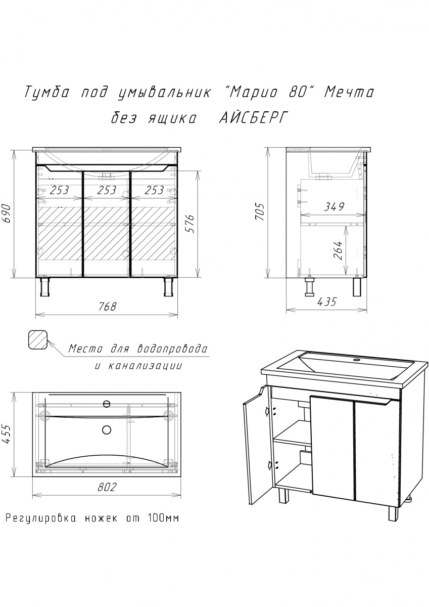 Тумба под умывальник ""Maria 80"" Мечта без ящика АЙСБЕРГ станет отличным дополнением для любой ванной комнаты. Тумбочка подходит для установки под раковину, обеспечивая удобство и стиль. Напольная конструкция позволяет легко разместить её в нужном месте, создавая гармоничное пространство.