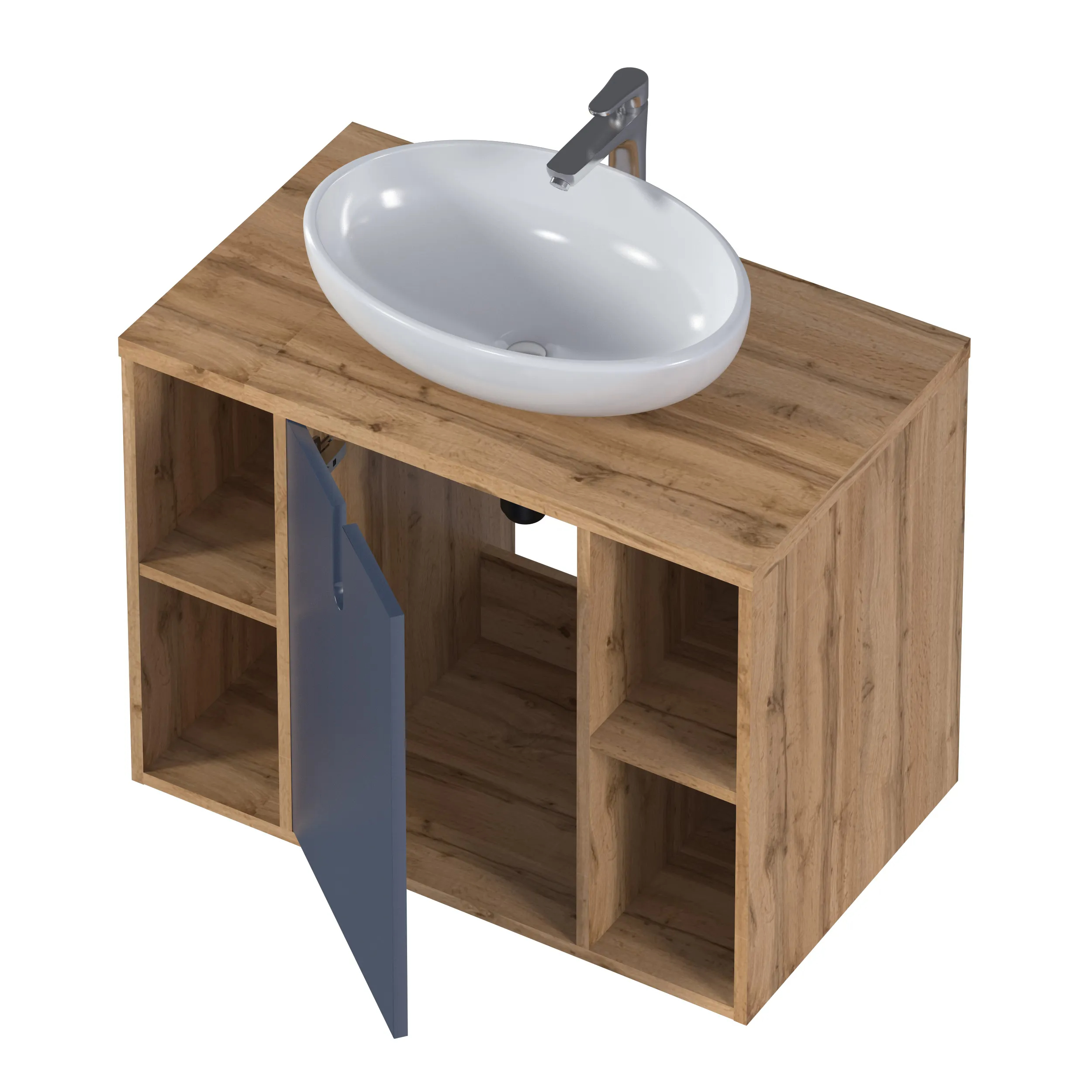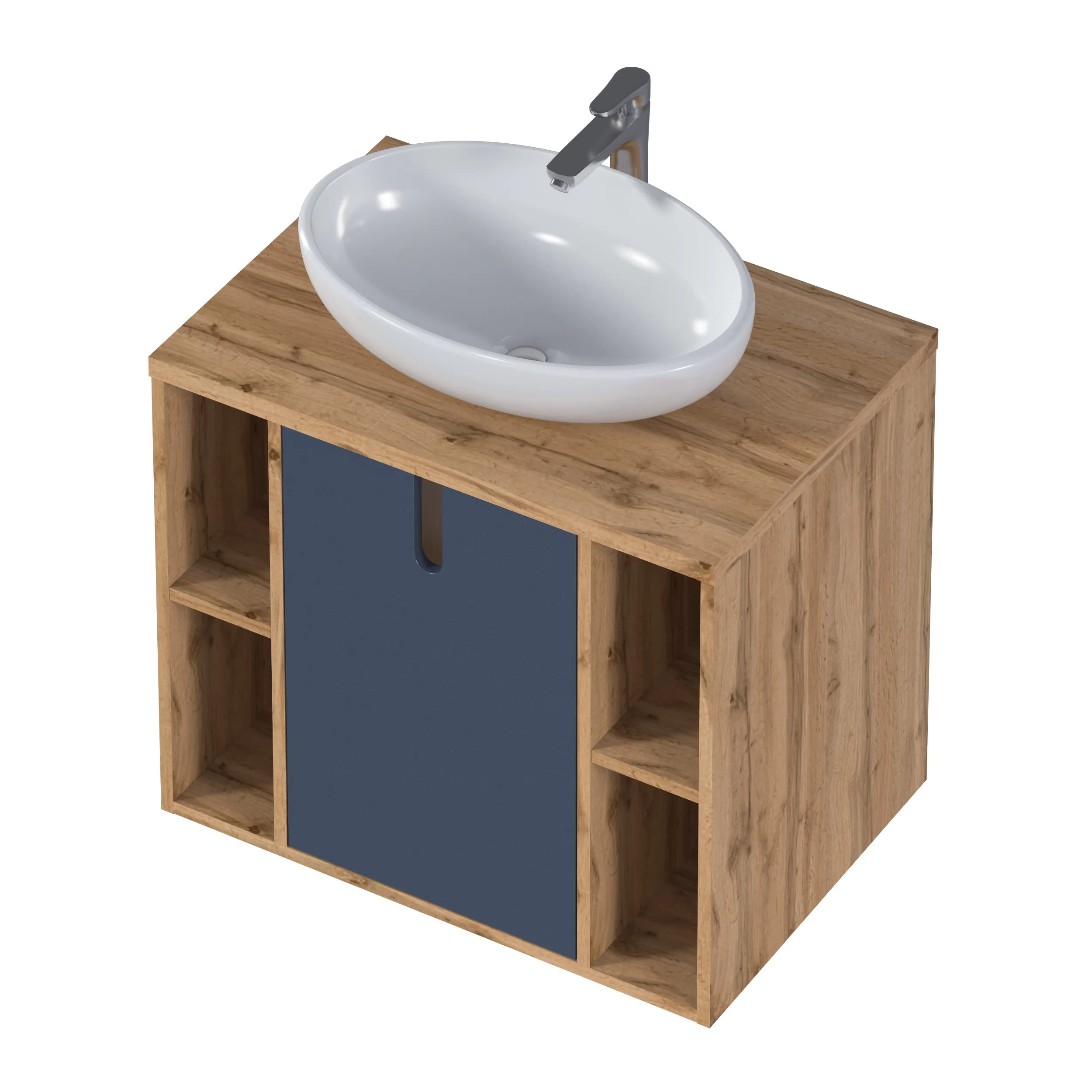 Подвесная тумба под накладную раковину с синим фасадом — удивительное решение для ванной со своей философией. Темно-синий оттенок фасада отражает глубину чувств, мыслей и эмоций. Такой цвет в сочетании с теплым древесным корпусом создает атмосферу внутреннего спокойствия, отдыха и самопознания.