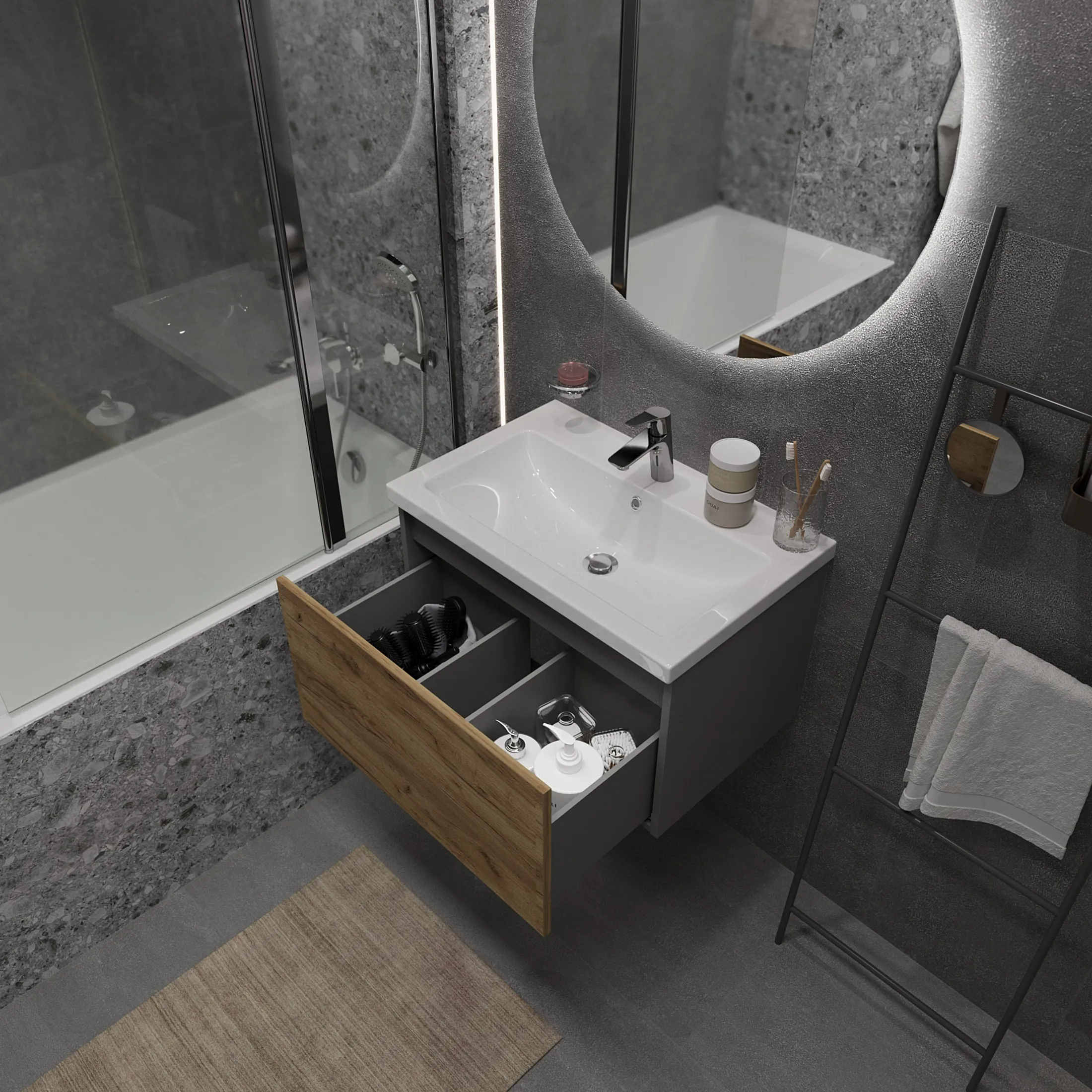 • Выдвижной ящик позволяет эффективно организовать хранение различных предметов – средств личной гигиены, косметики, полотенец, бытовой химии.