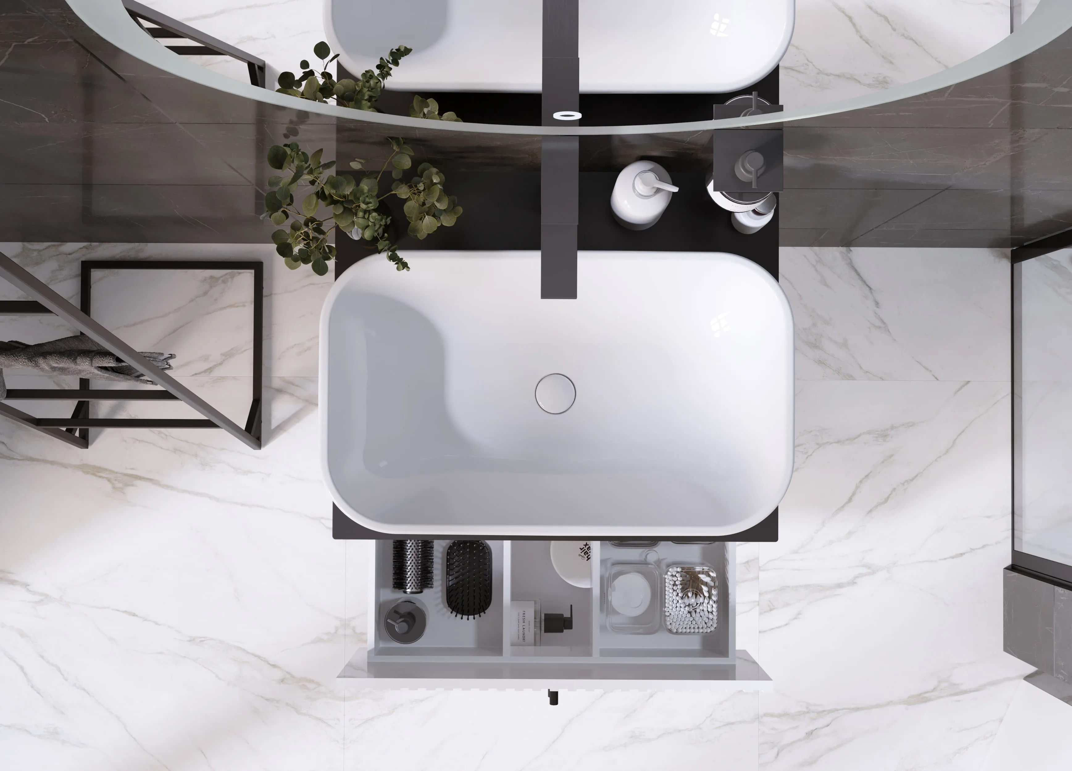 В выдвижных ящиках поместятся все необходимые принадлежности: средства личной гигиены, косметика, даже бытовая химия.