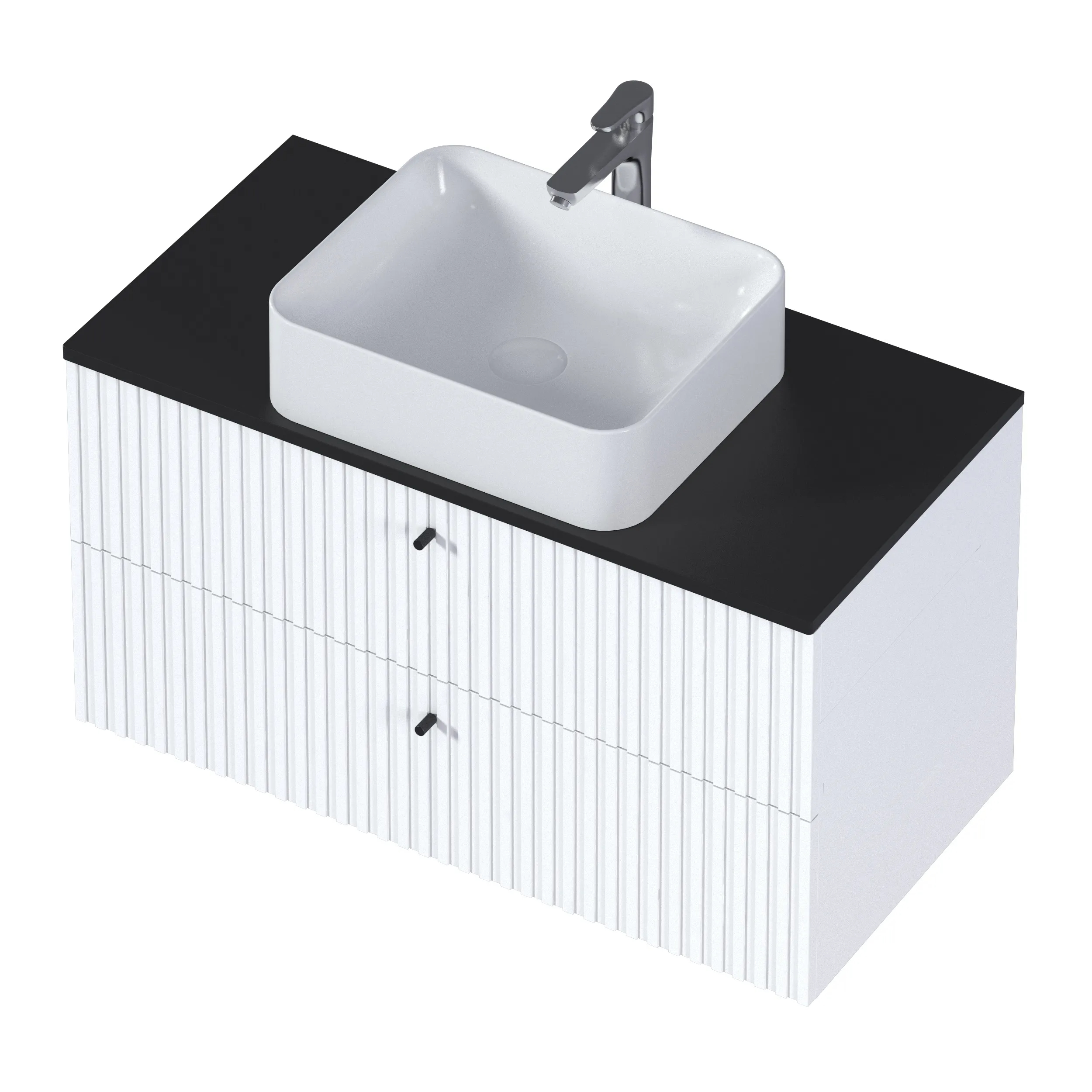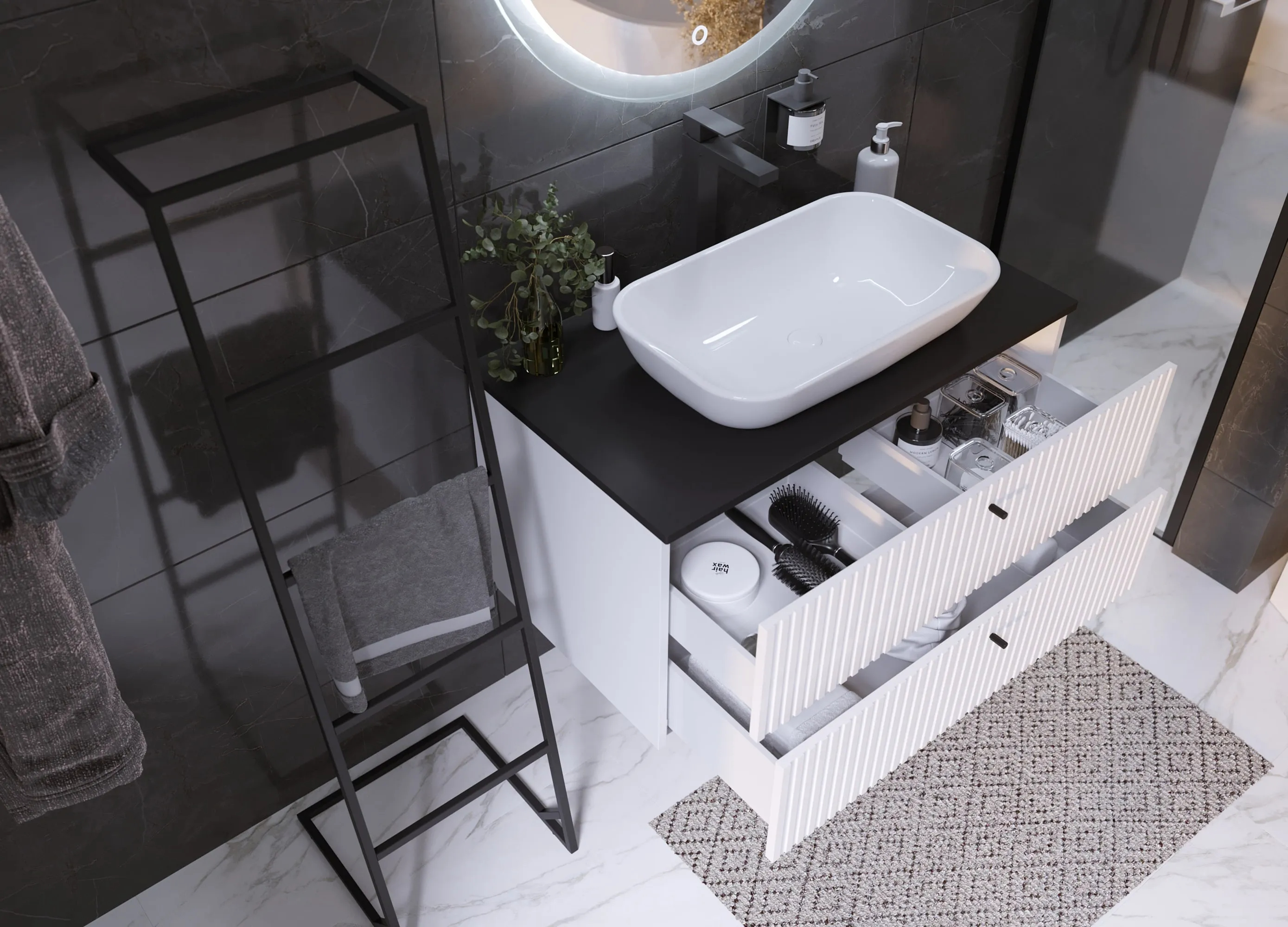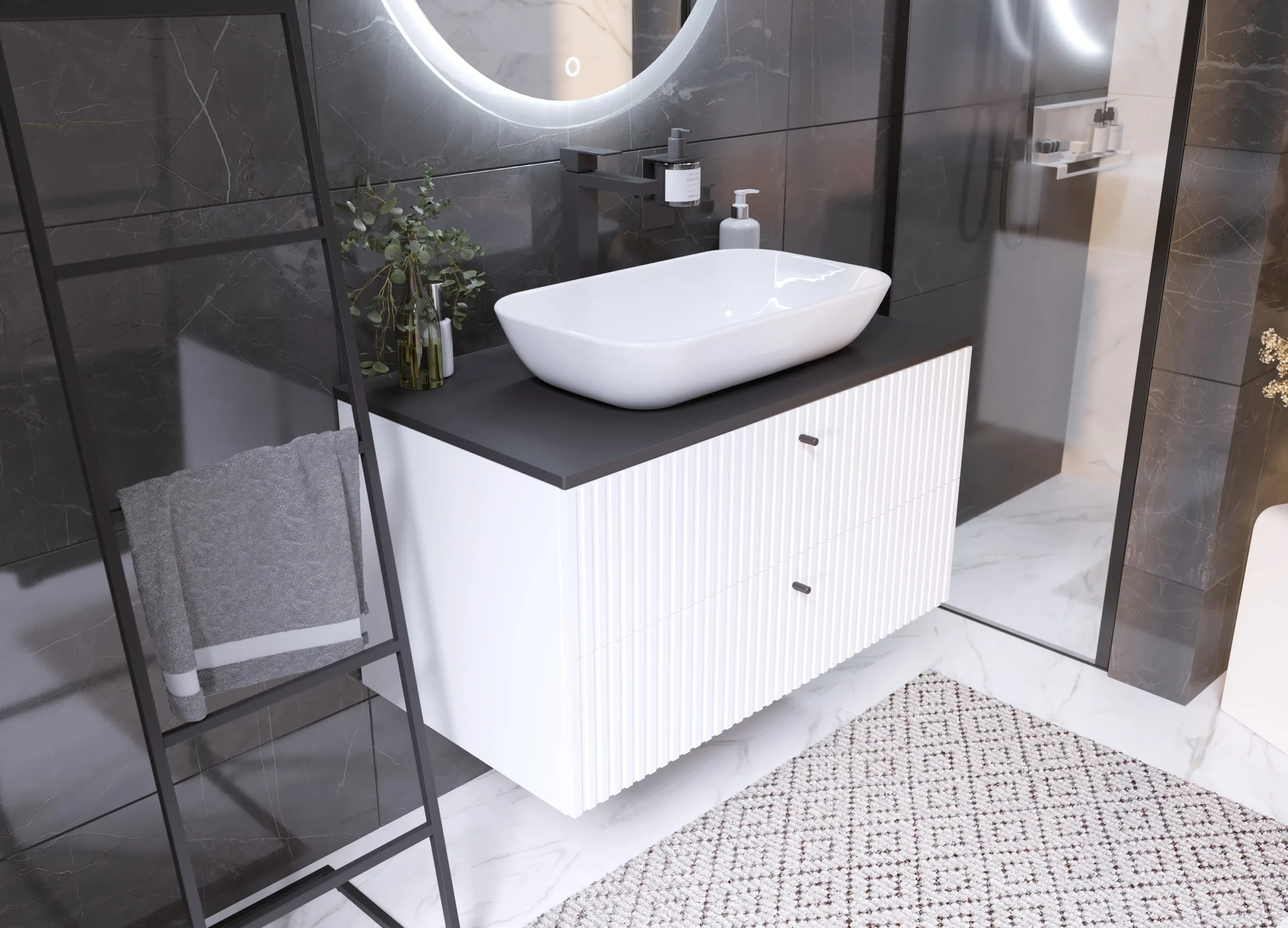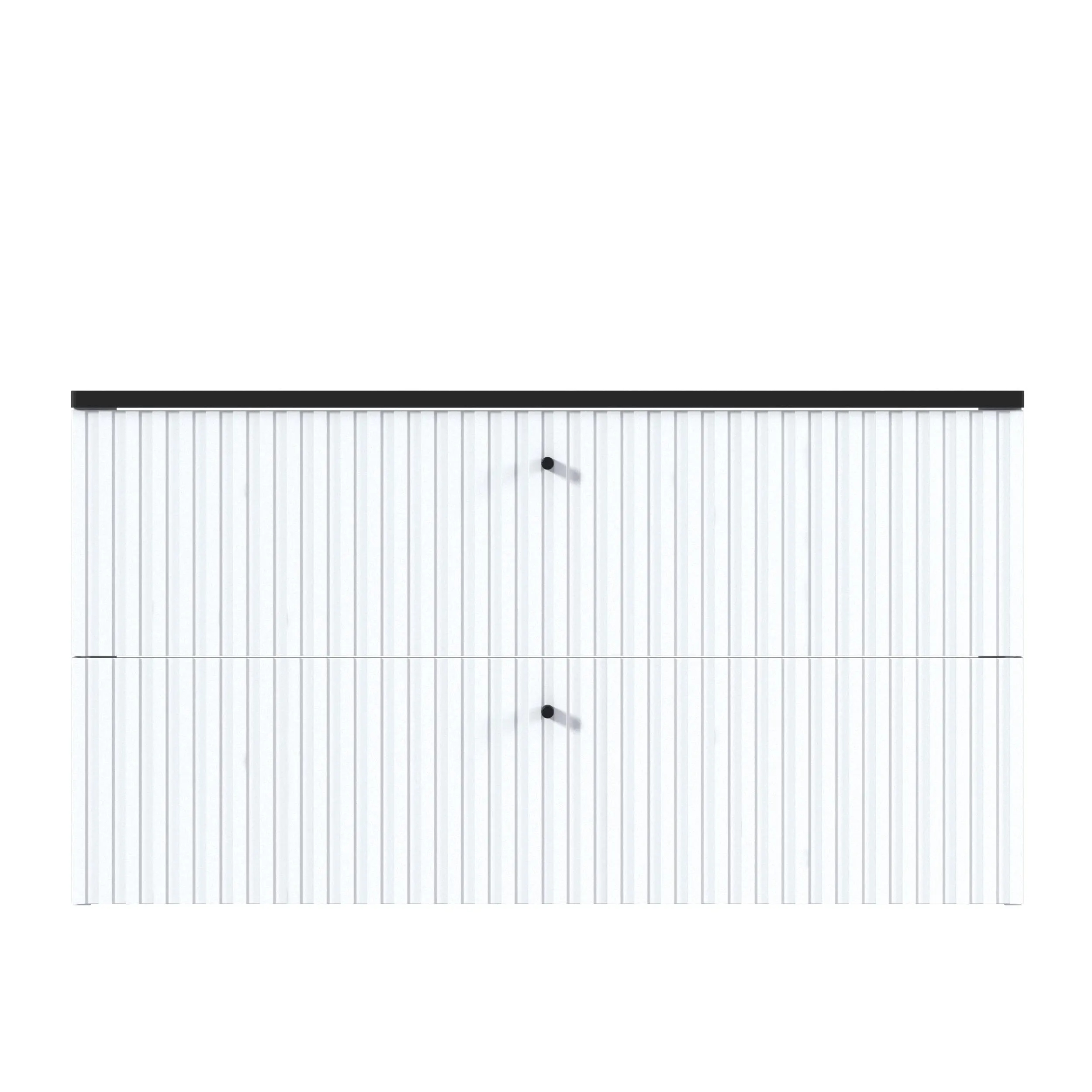 Тумба Desire – изящное решение для интерьера ванной комнаты. Рельефный фасад создает ритмичную игру света и теней. Черные ручки-кнопки контрастируют с белым фасадом и подчеркивают её современный дизайн.